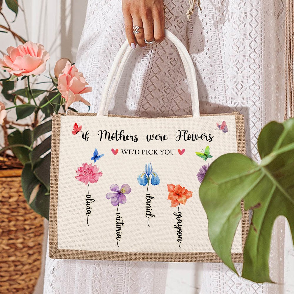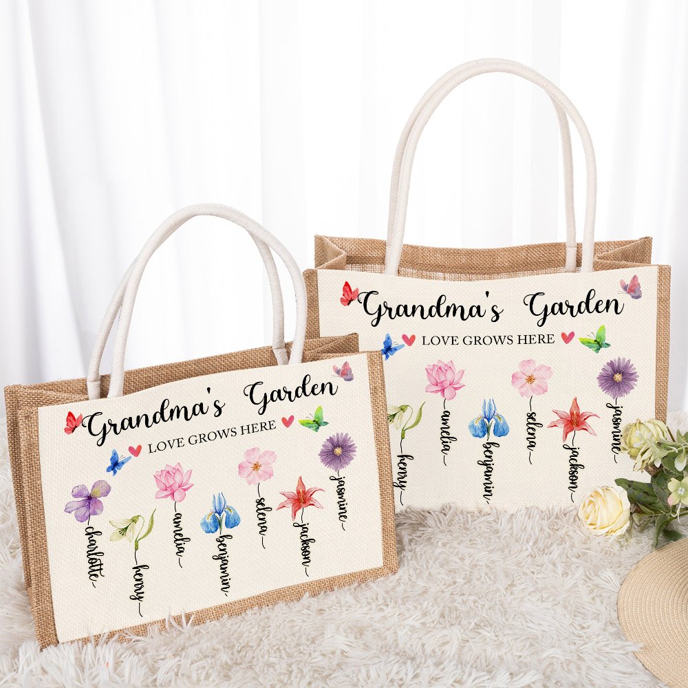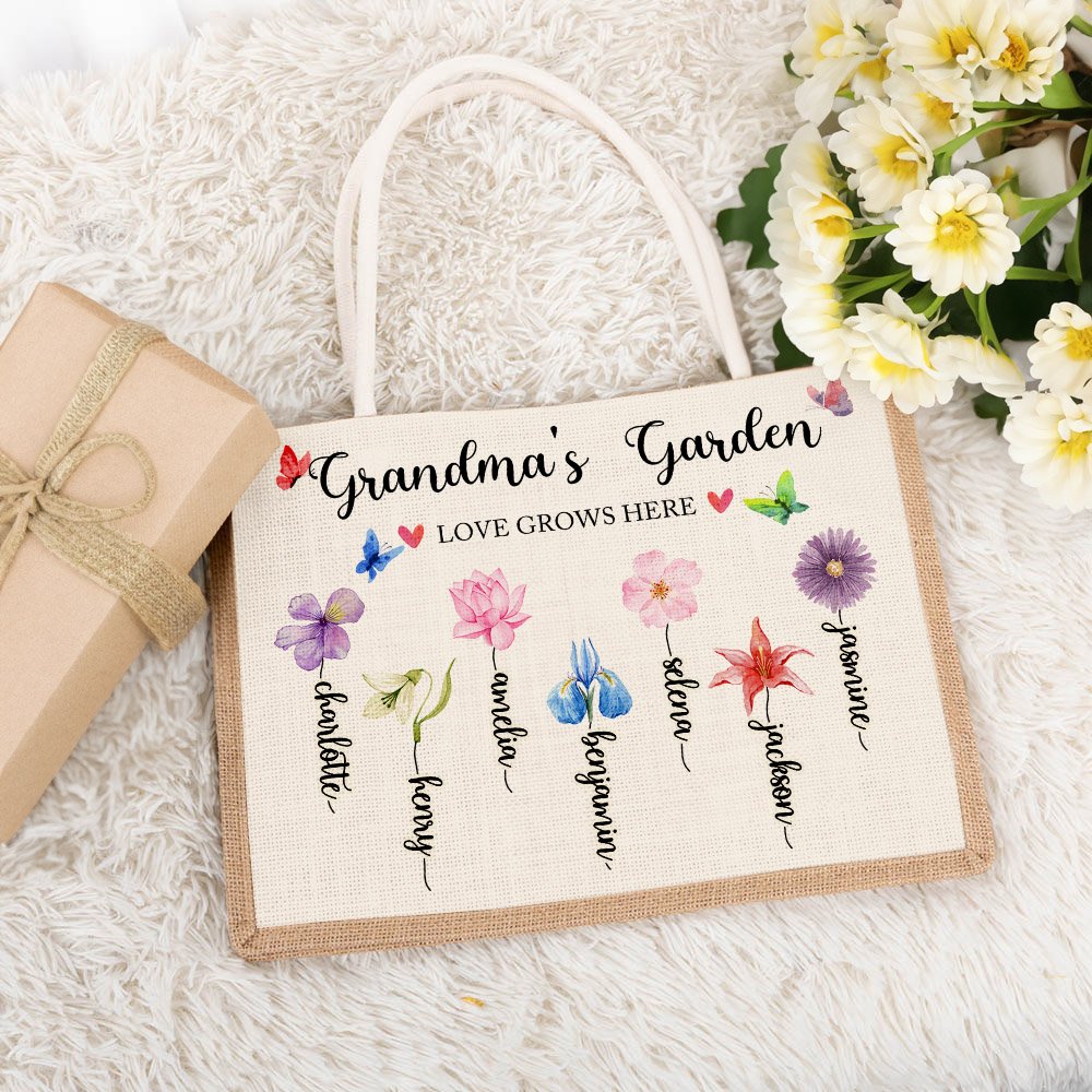 Die Tragetasche kann mit Text und 1 bis 13 Namen personalisiert werden, die jedes Familienmitglied repräsentieren. Jeder Geburtsmonat ist mit einer einzigartigen Blume verbunden, die verschiedene Qualitäten und Bedeutungen repräsentiert. So entsteht ein beeindruckendes Bild der Liebe und Verbundenheit, das sie zu einem geschätzten Geschenk für Omas und Mütter macht.