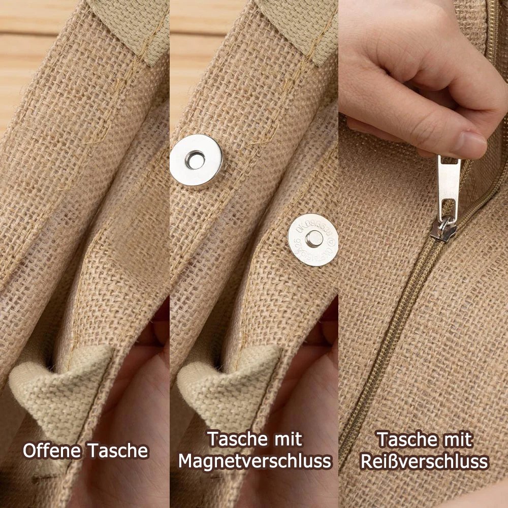 | Pflegehinweise: | • Reinigen Sie die Innenseite der Jutetaschen bitte sorgfältig mit kaltem Wasser. • Trocknen Sie die Taschen im Trockner bei niedriger Temperatur. • Bügeln Sie die Taschen bitte nicht oder nur bei sehr niedriger Hitze. • Vermeiden Sie das Bleichen und die chemische Reinigung. |