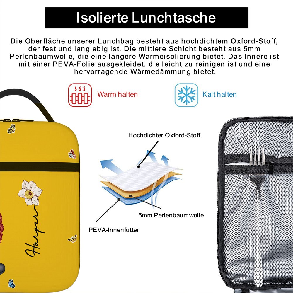 Diese Brotzeittasche ist mit einer anpassbaren Zeichentrickfigur bedruckt, um die Brotzeittasche noch persönlicher zu gestalten. Neben der Figur ist eine anpassbare Geburt Blume und Name, das Interesse an dem Muster hinzuzufügen und ein Gefühl der Verbindung zu dem Besitzer. 16 verschiedene Farben, um Ihre Auswahl zu bereichern.