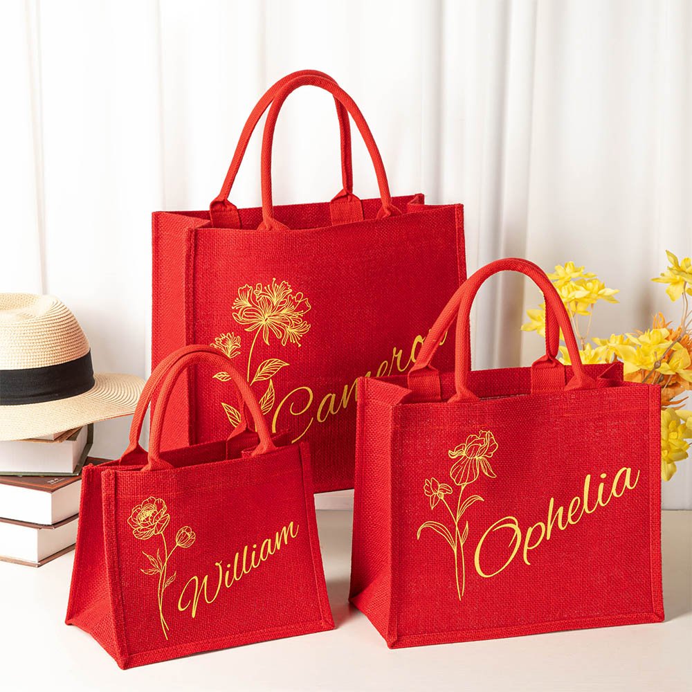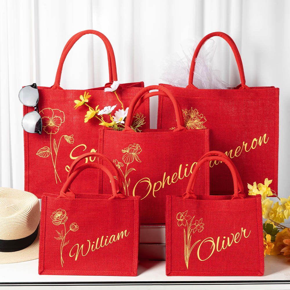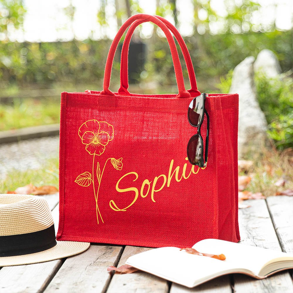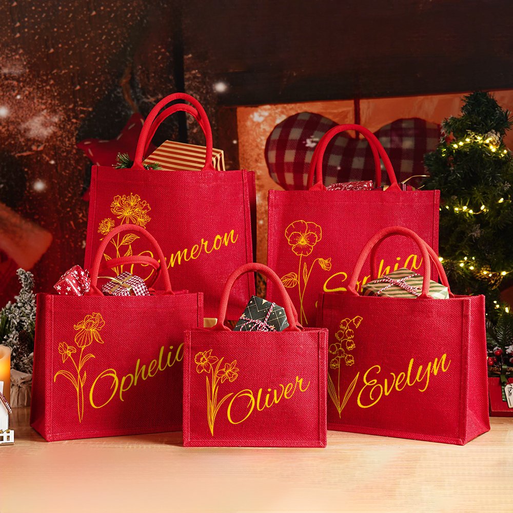 Diese Tragetasche aus Jute lässt sich mit einer Kombination aus dem von Ihnen gewählten Namen und der Geburtsblume personalisieren und ist damit ein einzigartiges Accessoire für den täglichen Gebrauch oder ein besonderes Weihnachtsgeschenk. Die Tasche bietet viel Platz für Spielzeug, Leckereien und andere schöne Dinge, die Sie Ihren Liebsten unter den Weihnachtsbaum legen können.