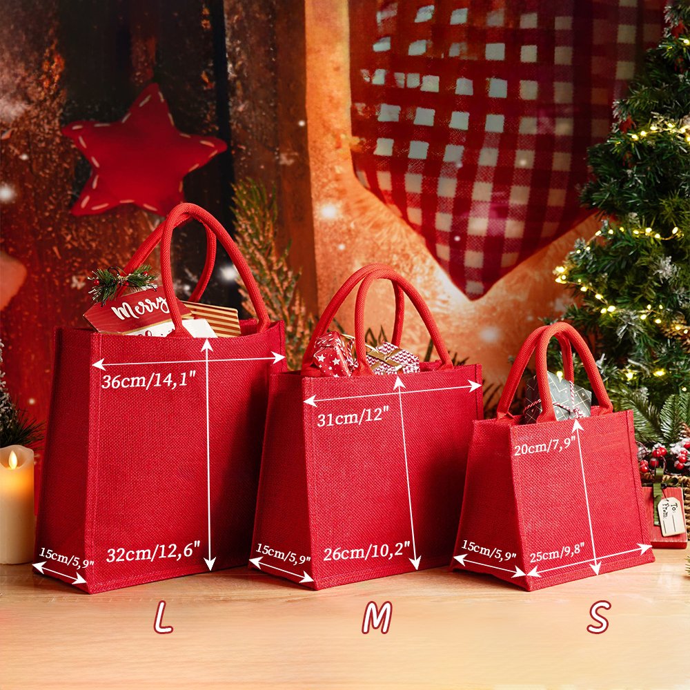 Der hochwertige rote Sackleinen-Stoff verleiht der Geschenktasche eine außergewöhnliche Textur und einen rustikalen Charme, was sowohl ihre Schönheit als auch ihre Umweltfreundlichkeit unterstreicht. Diese strapazierfähige Tragetasche wird für ihre hervorragende Handwerkskunst und ansprechende Ästhetik gelobt.