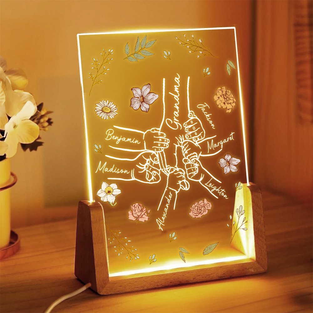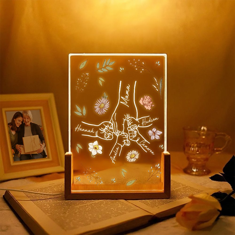 Inspiriert durch den warmen Moment von Mutter und Kind, die sich an den Händen halten, ist das Bild des Händchenhaltens mit einfachen Linien umrissen, kombiniert mit den Aquarellblumenelementen, die den Geburtstagsmonat symbolisieren, ist jedes Nachtlicht ein einzigartiges Bild der Familienzuneigung. Unterstützt die Anpassung von 1 bis 6 Namen der Kinder und den Namen oder Titel der Mutter, so dass jeder Name die sanfteste Existenz im Herzen der Mutter, die von außergewöhnlicher Bedeutung ist.