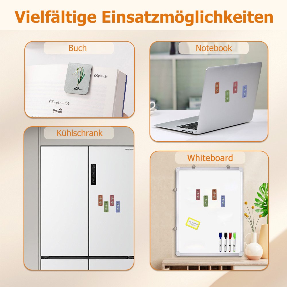 Das Lesezeichen aus hochwertigem PU-Leder mit feiner Verarbeitung und zarter Haptik ist sowohl leicht als auch langlebig. Der aufgedruckte Name bleibt klar und langlebig für den täglichen Gebrauch. Das magnetische Material und die Lagenstruktur sind so optimiert, dass bei wiederholter Verwendung keine Kratzer oder Risse entstehen, wodurch Bücher geschützt und das Leseerlebnis verbessert wird.