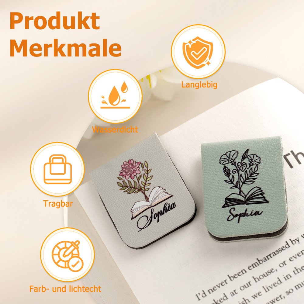 Inspiriert von den Geburtsblumen der einzelnen Monate trägt dieses magnetische Lesezeichen eine besondere, persönliche Bedeutung. Durch die Personalisierung mit einem Namen entsteht ein einzigartiges Accessoire für Bücherfreunde. Ihnen stehen zwölf sorgfältig gestaltete Geburtsblumenmotive zur Auswahl – wahlweise farbig oder in elegantem Schwarz-Weiß.