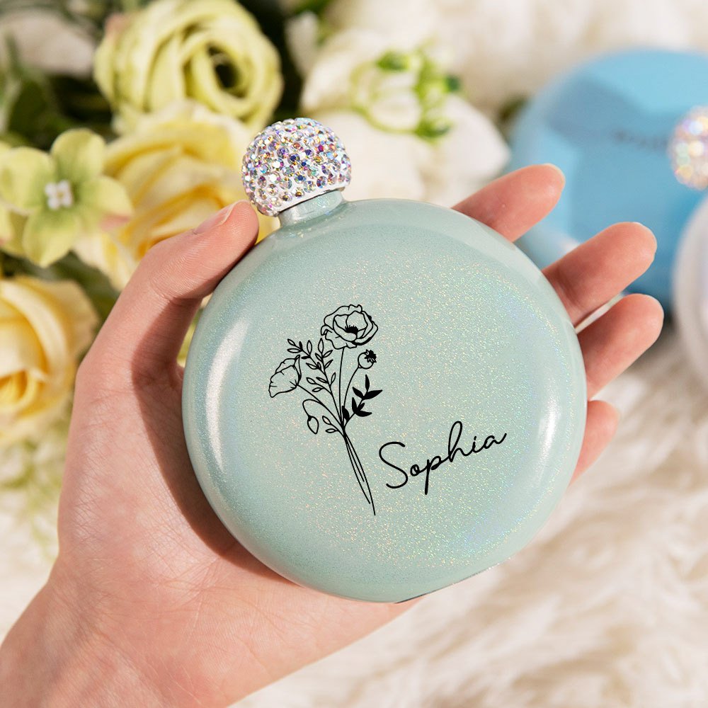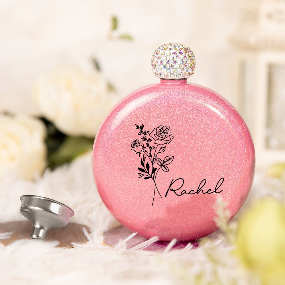 Personalisierte Geburt Blume Glitter Runde Kolben mit Strass Deckel und Name Geburtstag Brautjungfer Party Geschenk für sie