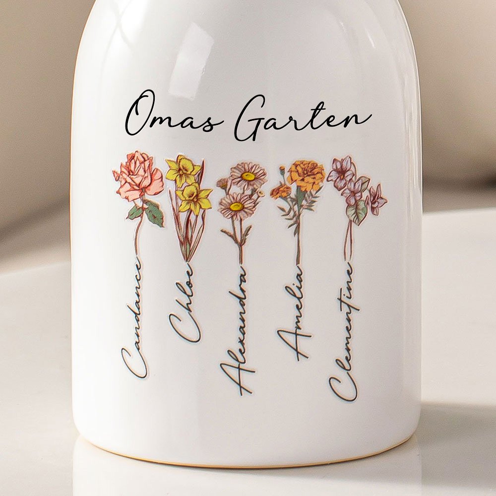 Unsere exquisite Keramikvase mit Geburtsblumen ist ein einzigartiges und herzliches Geschenk zum Muttertag. Die Vase ist mit Vintage-Stil Geburt Blumen gedruckt, und Sie können 1-20 Geburtsblumen und die entsprechenden Namen der einzelnen Familienmitglieder anpassen, um Ihre Dankbarkeit an Ihre Mutter oder Großmutter auszudrücken.