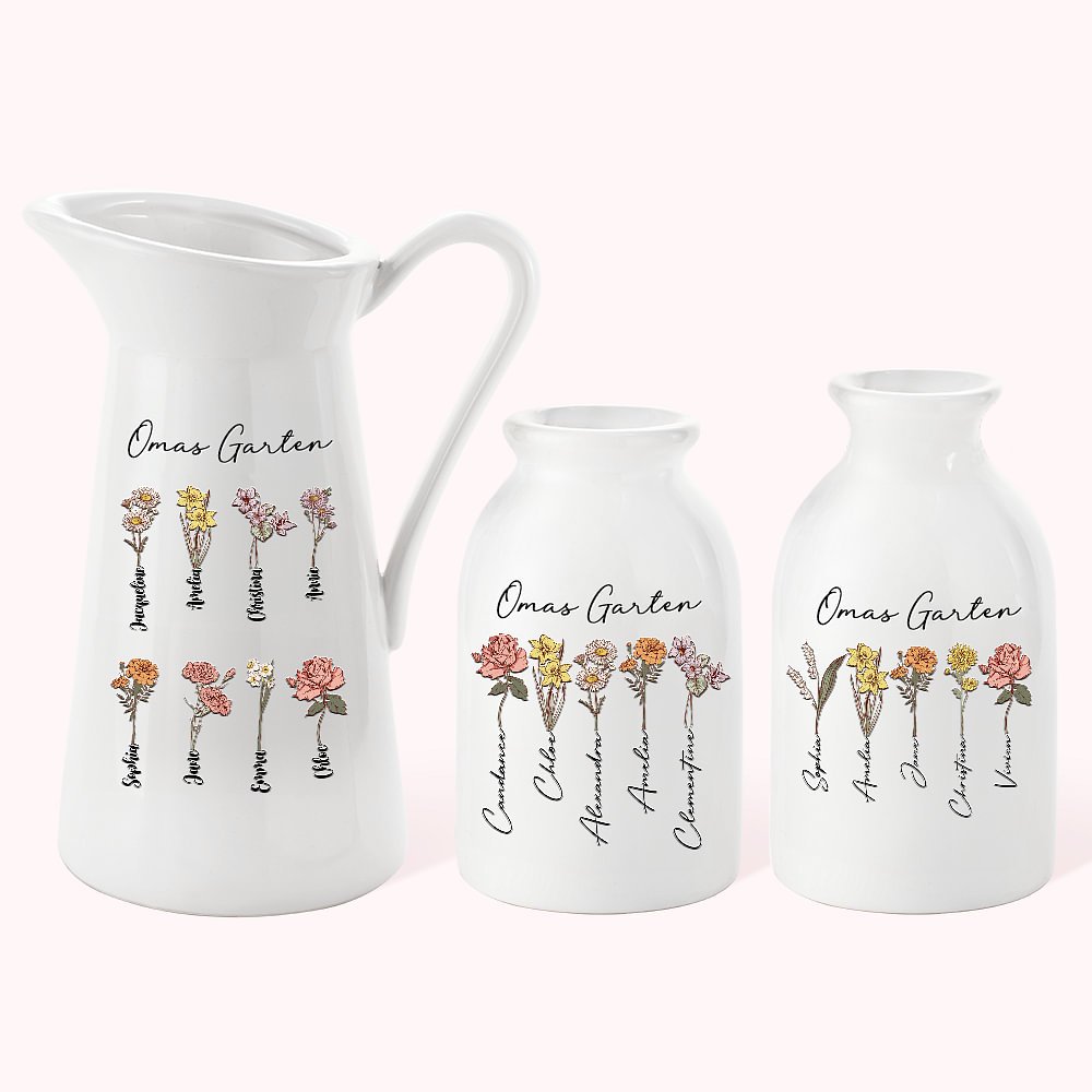 Unsere exquisite Keramikvase mit Geburtsblumen ist ein einzigartiges und herzliches Geschenk zum Muttertag. Die Vase ist mit Vintage-Stil Geburt Blumen gedruckt, und Sie können 1-20 Geburtsblumen und die entsprechenden Namen der einzelnen Familienmitglieder anpassen, um Ihre Dankbarkeit an Ihre Mutter oder Großmutter auszudrücken.
