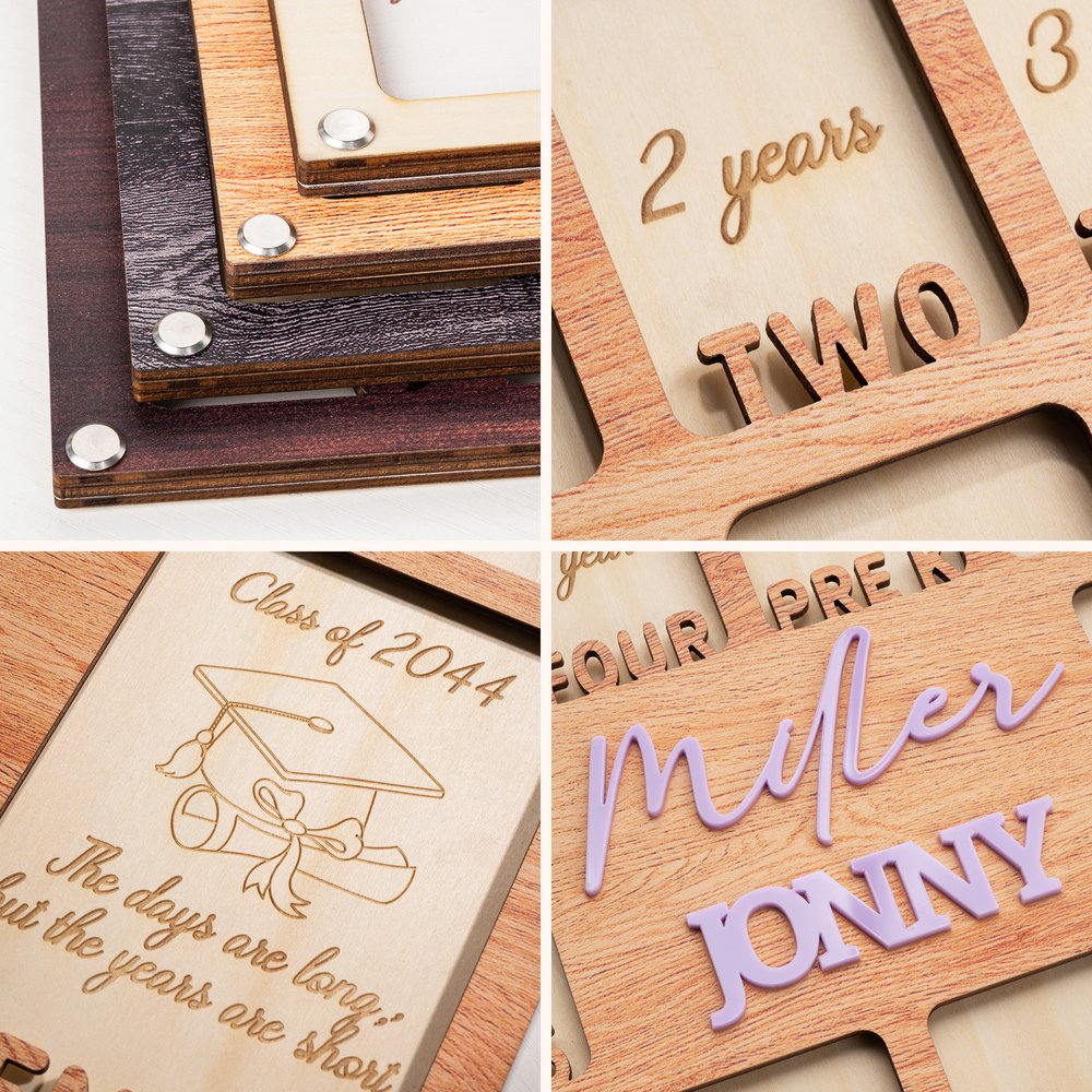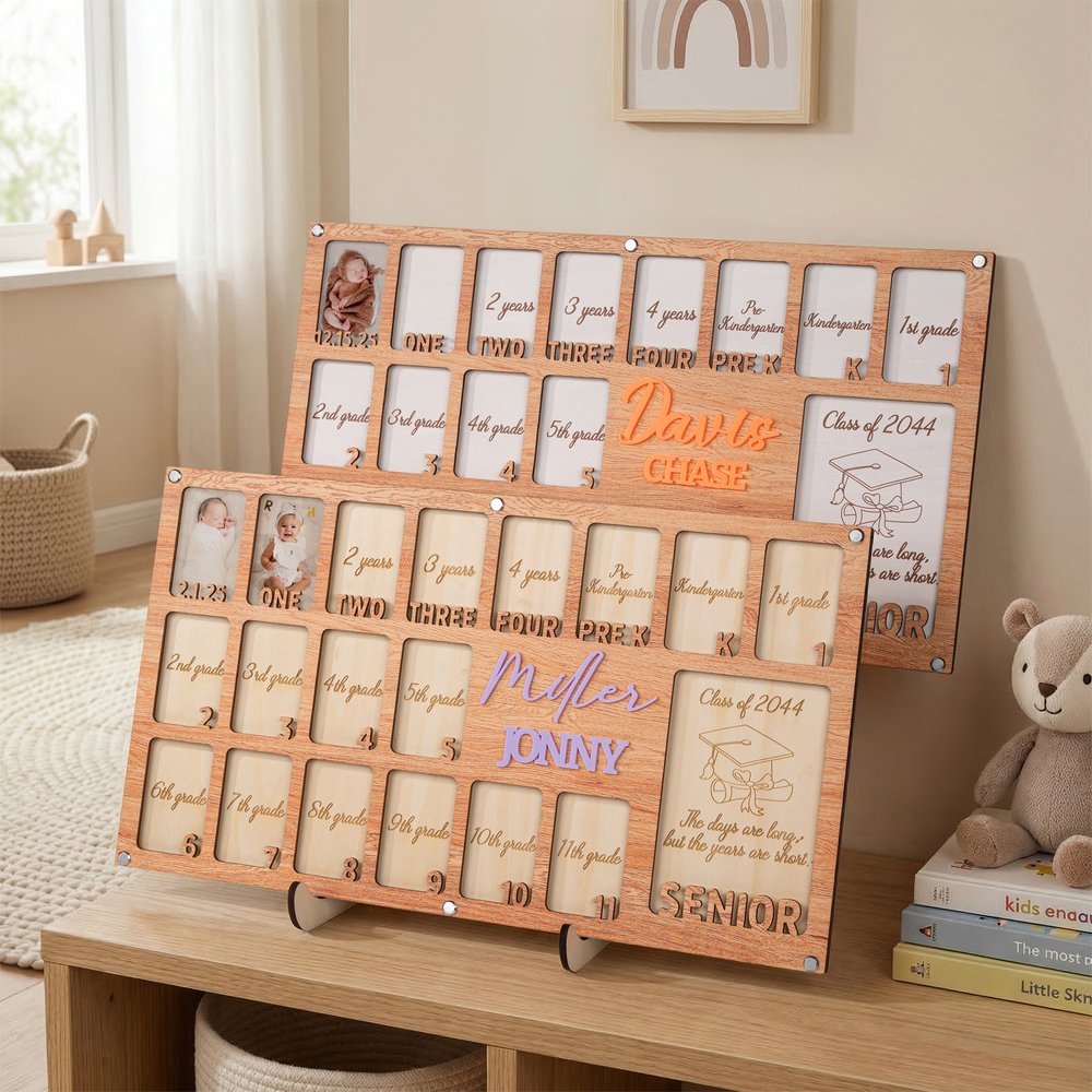 Inspiriert von der Bildungsreise eines Kindes, deckt dieser Rahmen jede Phase ab - von der Vorschule bis zum Schulabschluss. Er kann mit einem Namen versehen werden und ist in verschiedenen Farben erhältlich. Außerdem können Sie Geburtsdaten und Abschlussjahre markieren und so jeden wertvollen Meilenstein auf dem Weg dorthin festhalten.