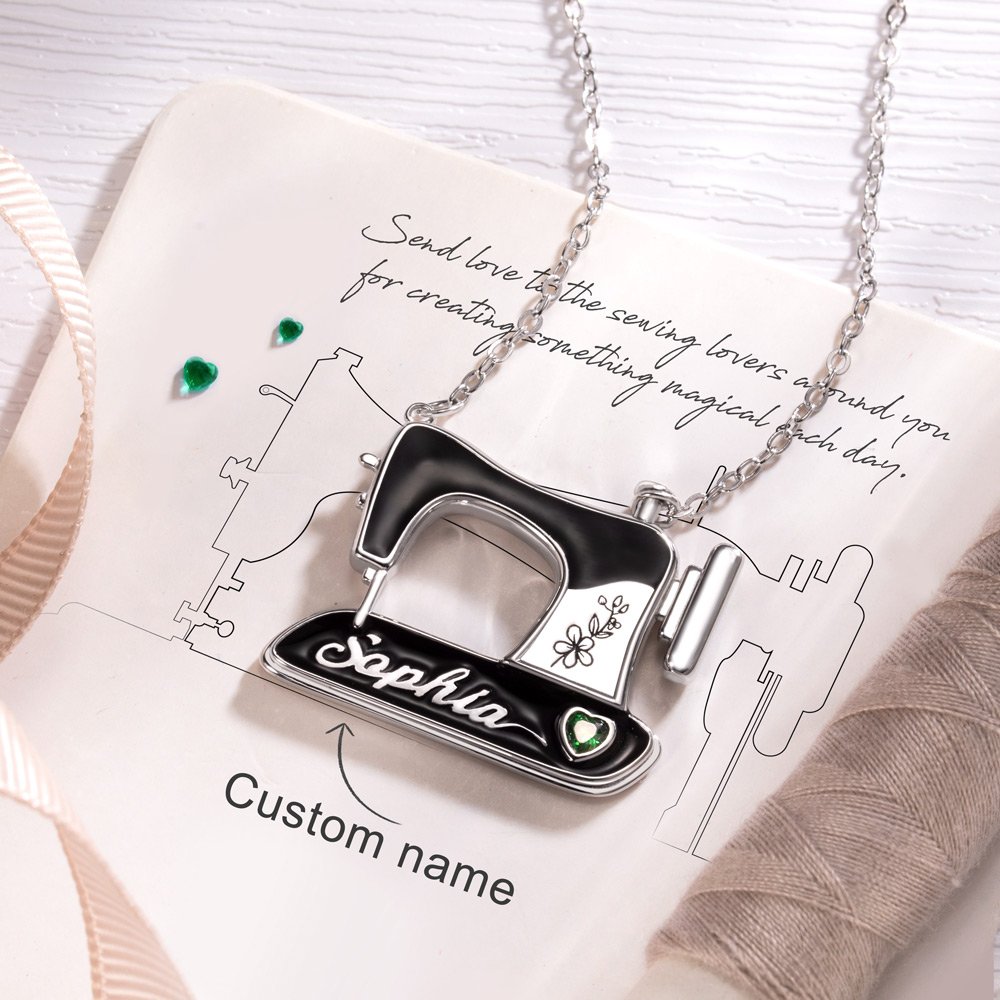 Der Nähmaschinen-Anhänger mit Geburtsblume und funkelndem Geburtsstein-Design verleiht dem Outfit einen klassischen Touch. -