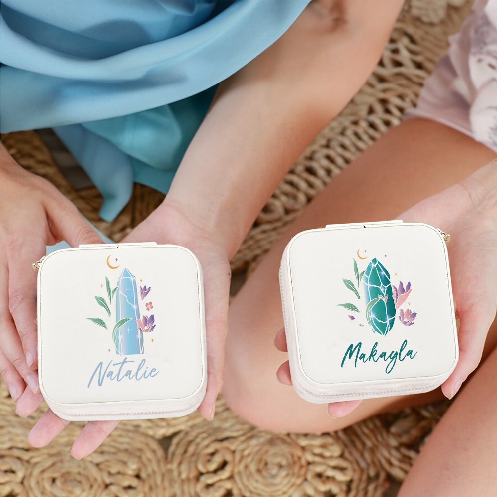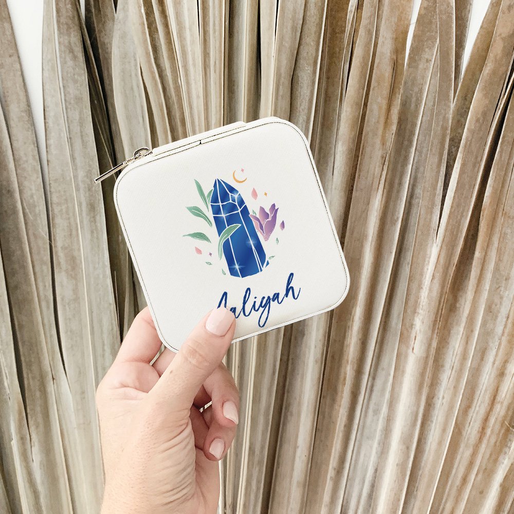 Dieses Schmuckkästchen zeigt ein lebhaftes Geburtssteindesign mit stilisierten Blättern, Blumen, Monden und Sternen und kann mit dem Namen des Empfängers personalisiert werden, wodurch jedes Kästchen zu einem einzigartigen Kunstwerk wird.
