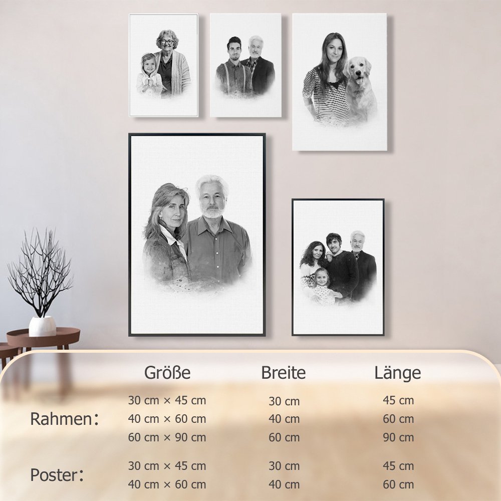 Jeder Poster verewigt das Lächeln und die Herzlichkeit der verstorbenen Familienmitglieder. Ob im Wohnzimmer oder in einer ruhigen Ecke, diese Porträts wecken wertvolle Erinnerungen und lassen Sie Ihre Gegenwart und Liebe mit jedem Blick spüren.