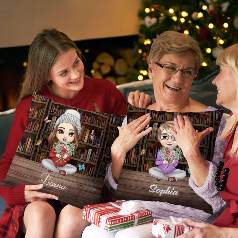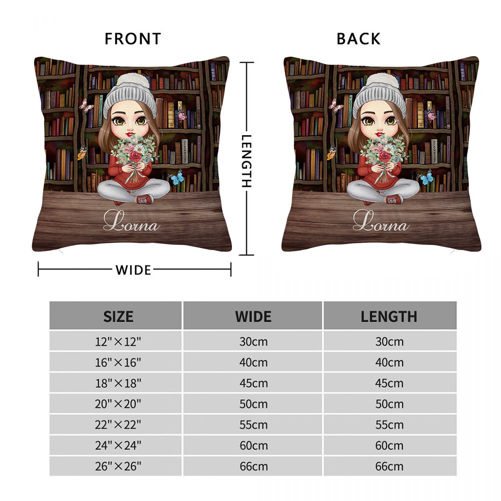 Dieser Kissenbezug zeichnet sich durch ein charmantes Cartoon-Design aus und kann mit Ihrem Namen und einem schönen Strauß Geburtsblumen individuell gestaltet werden. Kombiniert mit dem Hintergrund von Bücherregalen voller Bücher, sieht es stilvoll und einzigartig, sehr auffällig.