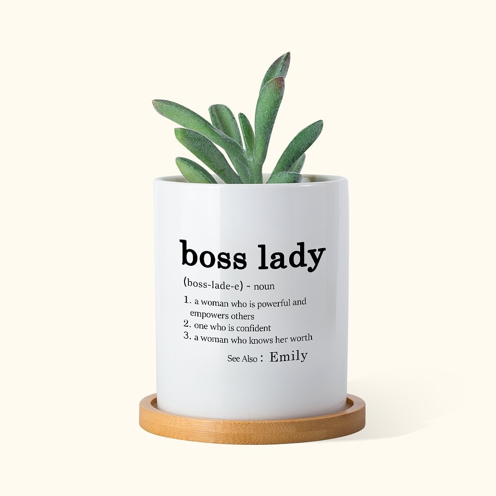 Dieser Keramik-Pflanztopf ist wunderschön mit der Definition von "Boss Lady" personalisiert und zelebriert die Stärke, Führung und Anmut von Frauen in Machtpositionen. Das schlichte, moderne Design eignet sich perfekt für die Dekoration jedes Arbeitsbereichs oder Heimbüros.