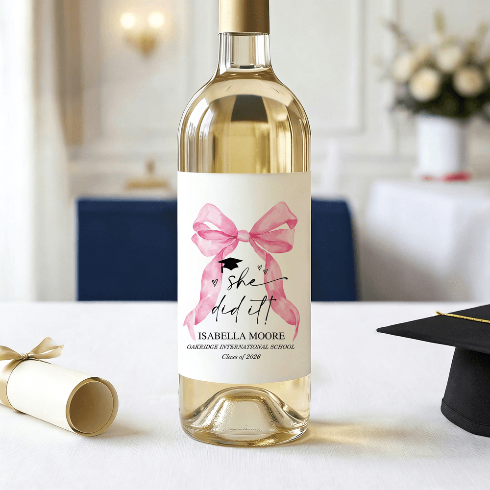 Dieser Weinaufkleber für die Abschlussfeier ist mit einer zarten Aquarellschleife, einer kleinen Abschlussmütze und dem süßen Schriftzug "Sie hat es geschafft" in der Mitte versehen. Sie können den Aufkleber mit dem vollständigen Namen der Absolventin, dem Namen der Schule und dem Jahr der Abschlussklasse versehen und so ein ganz individuelles Design gestalten. Sie ist in vier flexiblen Größen erhältlich und passt auf fast jede Standard-Weinflasche. So wird aus einer gewöhnlichen Flasche im Handumdrehen ein wunderschönes, individuelles Stück, das jede Abschlussfeier aufwertet.