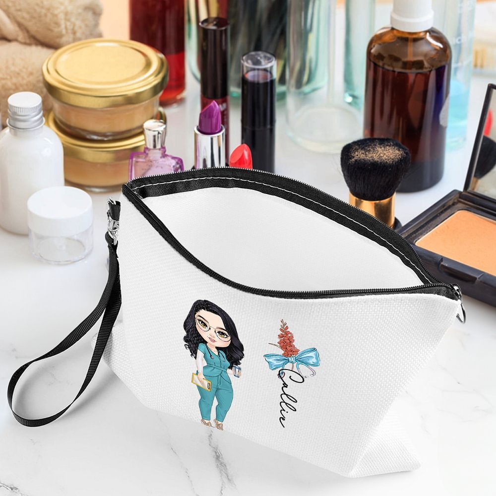 Diese Kosmetiktasche verbindet nahtlos medizinische Elemente mit stilvollen persönlichen Akzenten. Mit einer medizinischen Cartoon-Figur, einem Stethoskop, einer Geburtsblume und einer niedlichen Schleife mit einem persönlichen Namen ist sie ein auffälliges Accessoire für alle, die im Gesundheitswesen tätig sind.