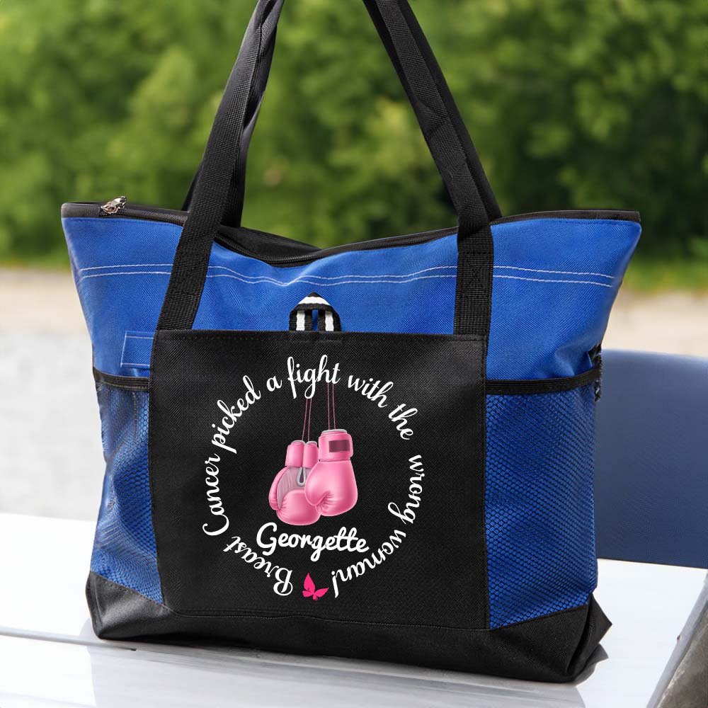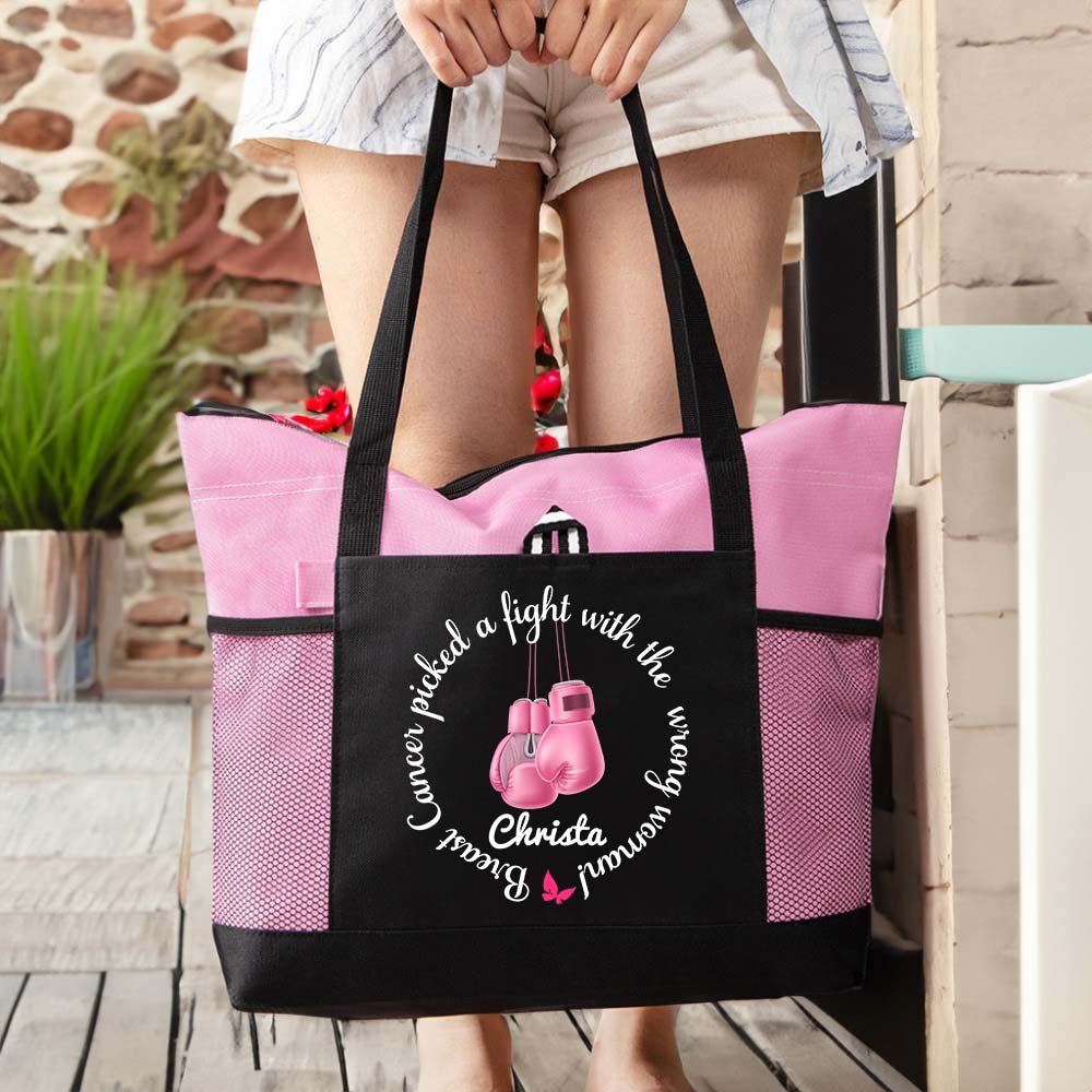 Auf dieser Tasche steht "Brustkrebs hat sich den Kampf mit der falschen Frau ausgesucht!". Dieser Ausdruck vermittelt die Botschaft, dass Brustkrebs im Angesicht von starken Frauen versagt. Er sendet eine Botschaft des Mutes und der Stärke an Brustkrebspatientinnen und ermutigt sie, die Krankheit zu bekämpfen und sie zu überwinden.