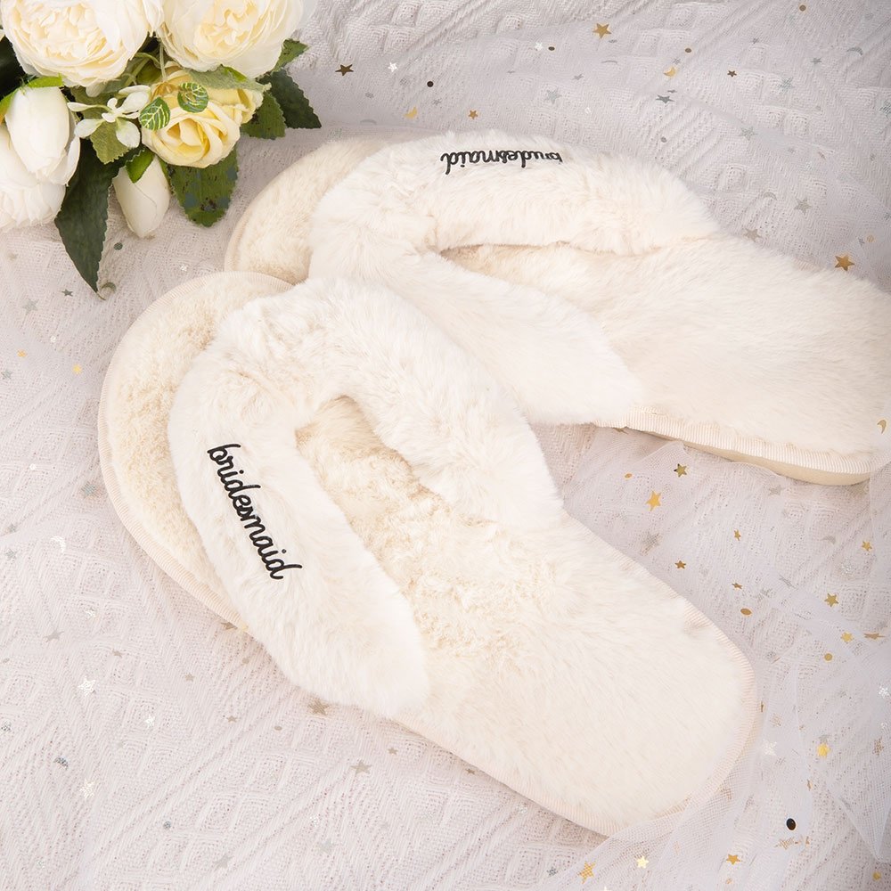 Die Hochzeit Partei Hausschuhe sind weiß, und jeder weiche Kunstpelz Hausschuhe ist mit der Braut, Brautjungfer, oder Babe gedruckt. Sie können auch den Namen oder Titel von dem, was Sie wollen, anpassen. Sie sind auch im Freien warm und eignen sich für romantische Hochzeitsfeiern. Sie spielen eine wichtige Rolle am großen Tag und begleiten die Braut durch eine einzigartige Hochzeitsvorbereitungszeit.