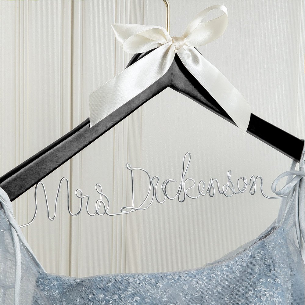 Die Bügel sind in verschiedenen Holzfarben erhältlich, und die individuellen Namen sind in vier Metallic-Farben erhältlich, die mit jedem Hochzeitskleid kombiniert werden können, um Eleganz zu zeigen. Darüber hinaus ist die passende Schleife Knoten ist auch in mehreren Farben erhältlich, um einen letzten Schliff zu Ihrer Hochzeit hinzuzufügen. Sie können den Schnürsenkel auch mit Ihrem Namen und Datum versehen, wobei Sie aus verschiedenen Mustern und Farben wählen können.