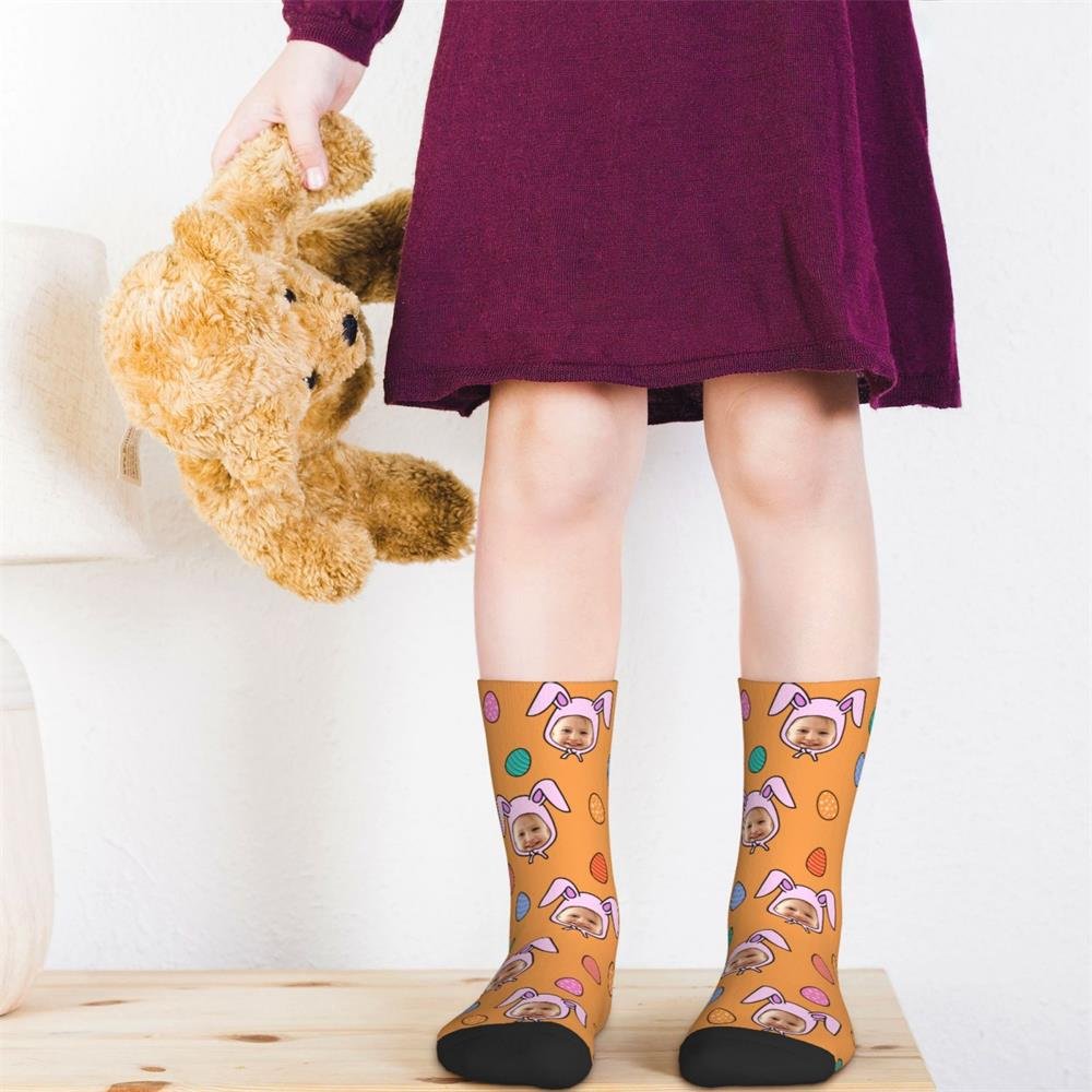 The pink bunny ears are added to the top of photos, creating a playful and charming look. The photo of your child, family member, friend, or pet can be beautifully printed on the socks, making them a truly unique and personalized gift.