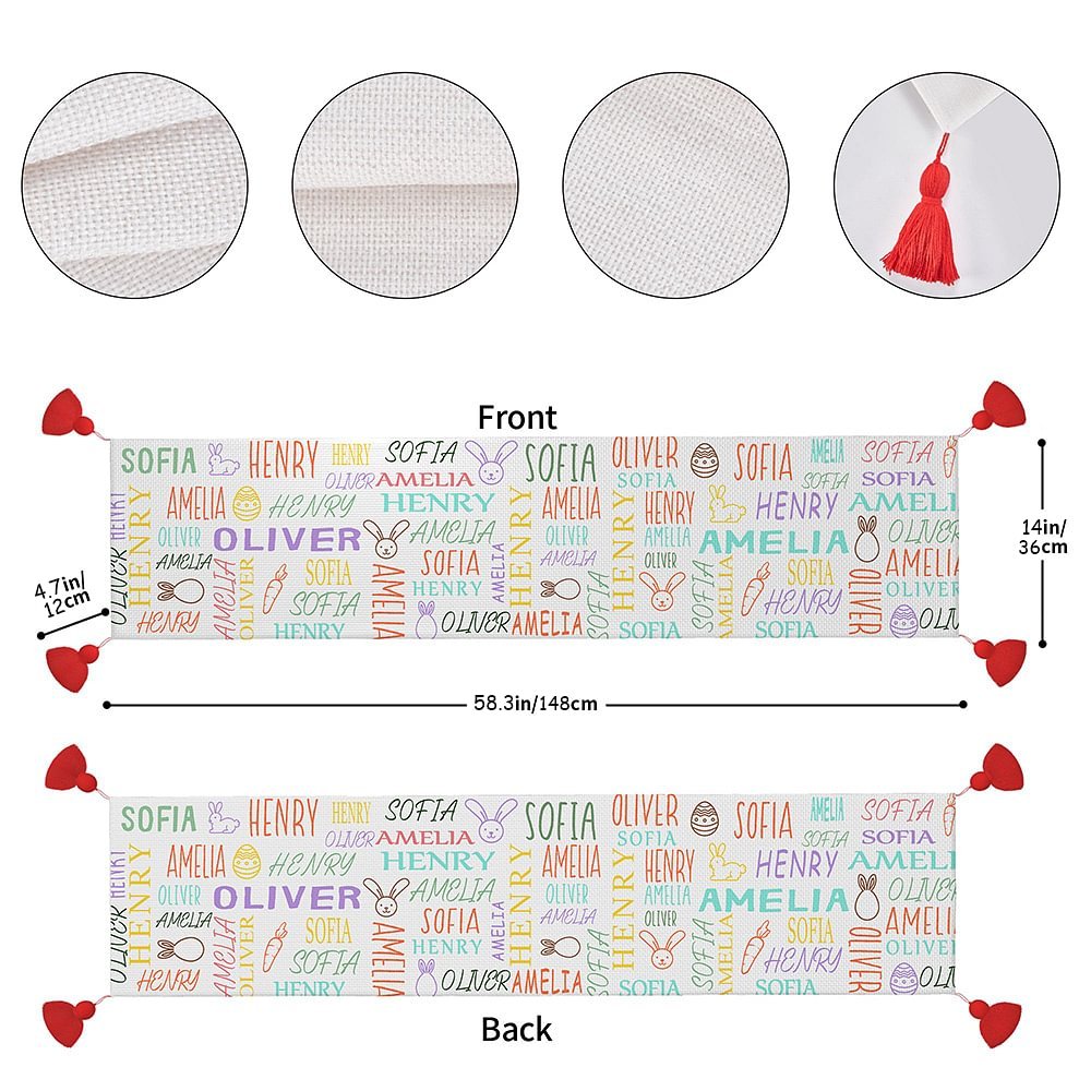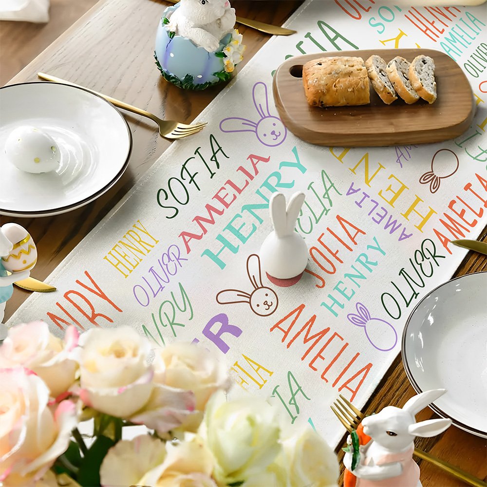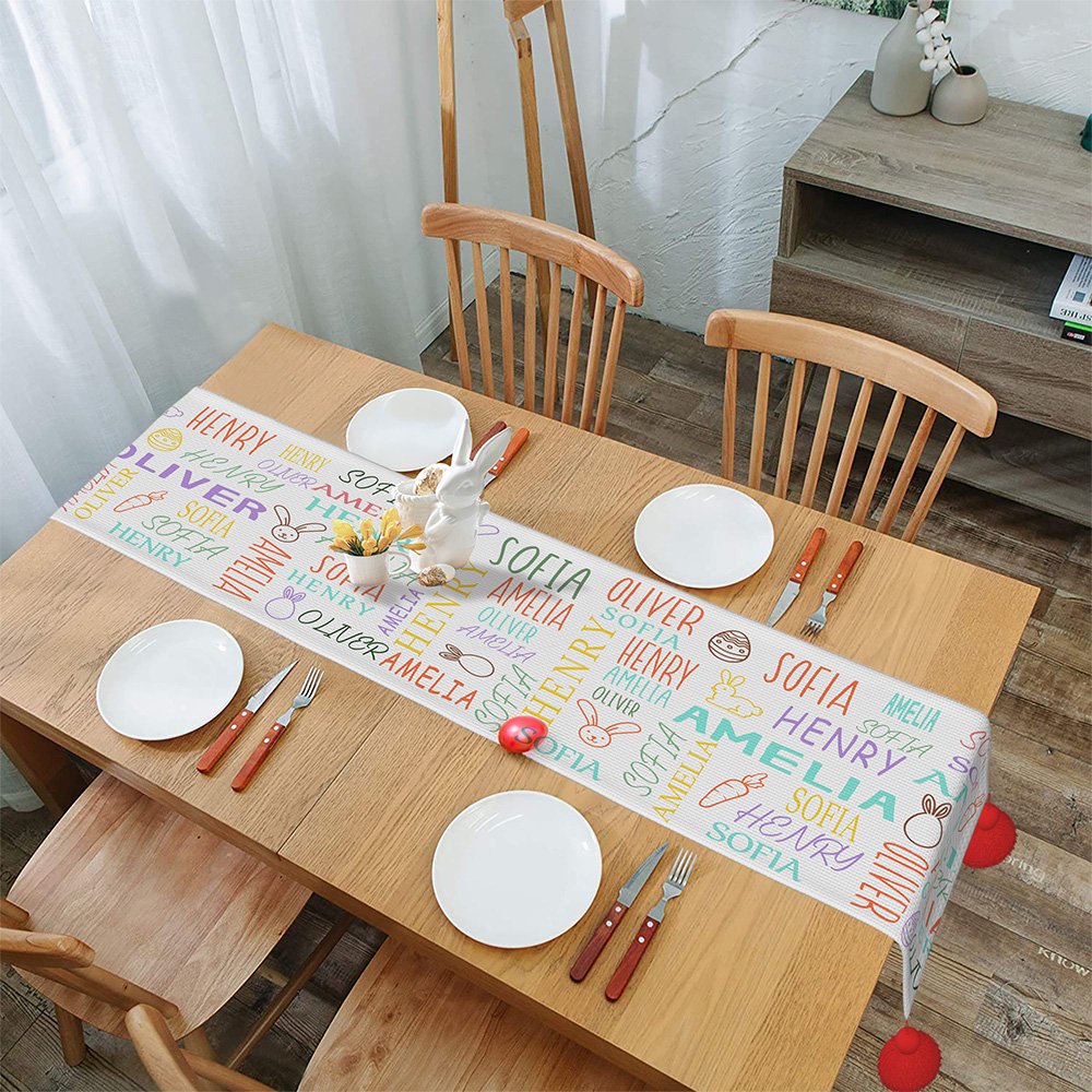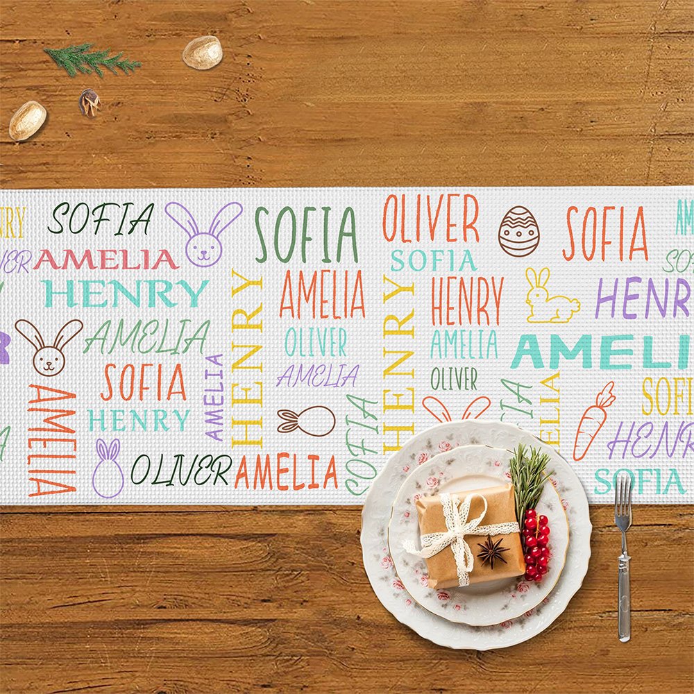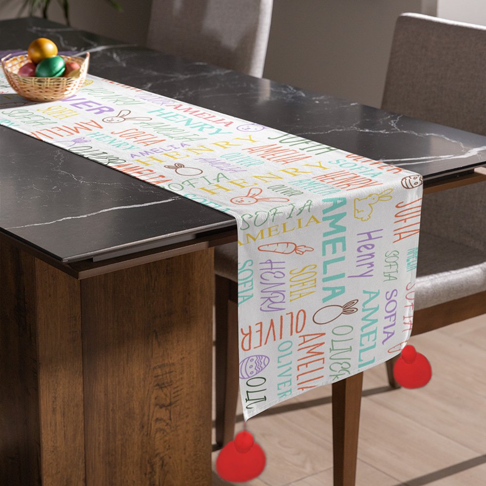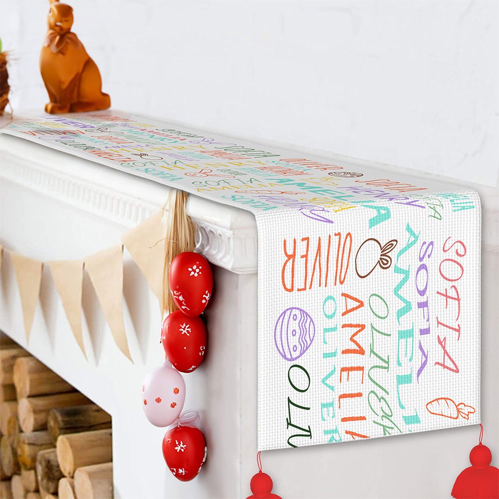 Dieser Tischläufer zeigt eine charmante Wortwolke, die Namen mit Bildern von Hasen, Eiern, Karotten und vielem mehr geschickt verbindet. Das clevere Design schafft ein optisch auffälliges Stück, das zum näheren Hinsehen einlädt und zu Gesprächen anregt. Die Wortwolke kann mit den Namen der Familienmitglieder personalisiert werden, wodurch jeder Tischläufer zu einem einmaligen Andenken wird.