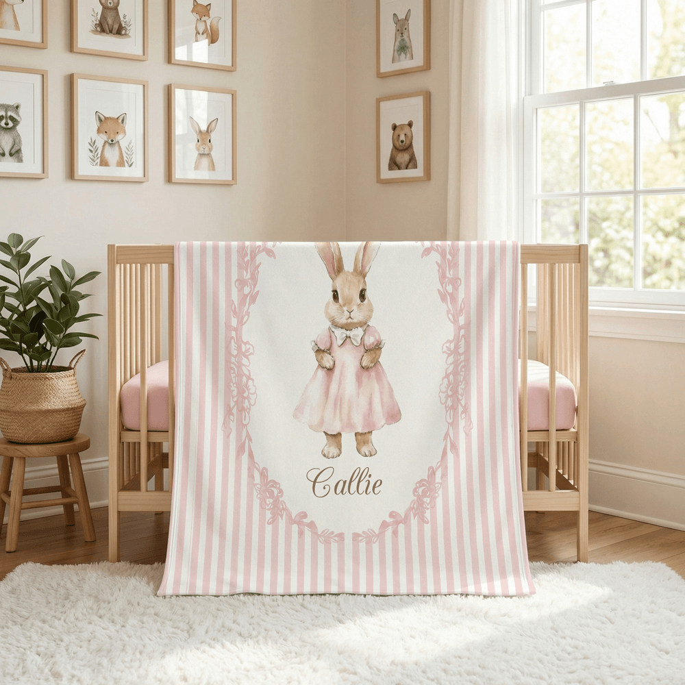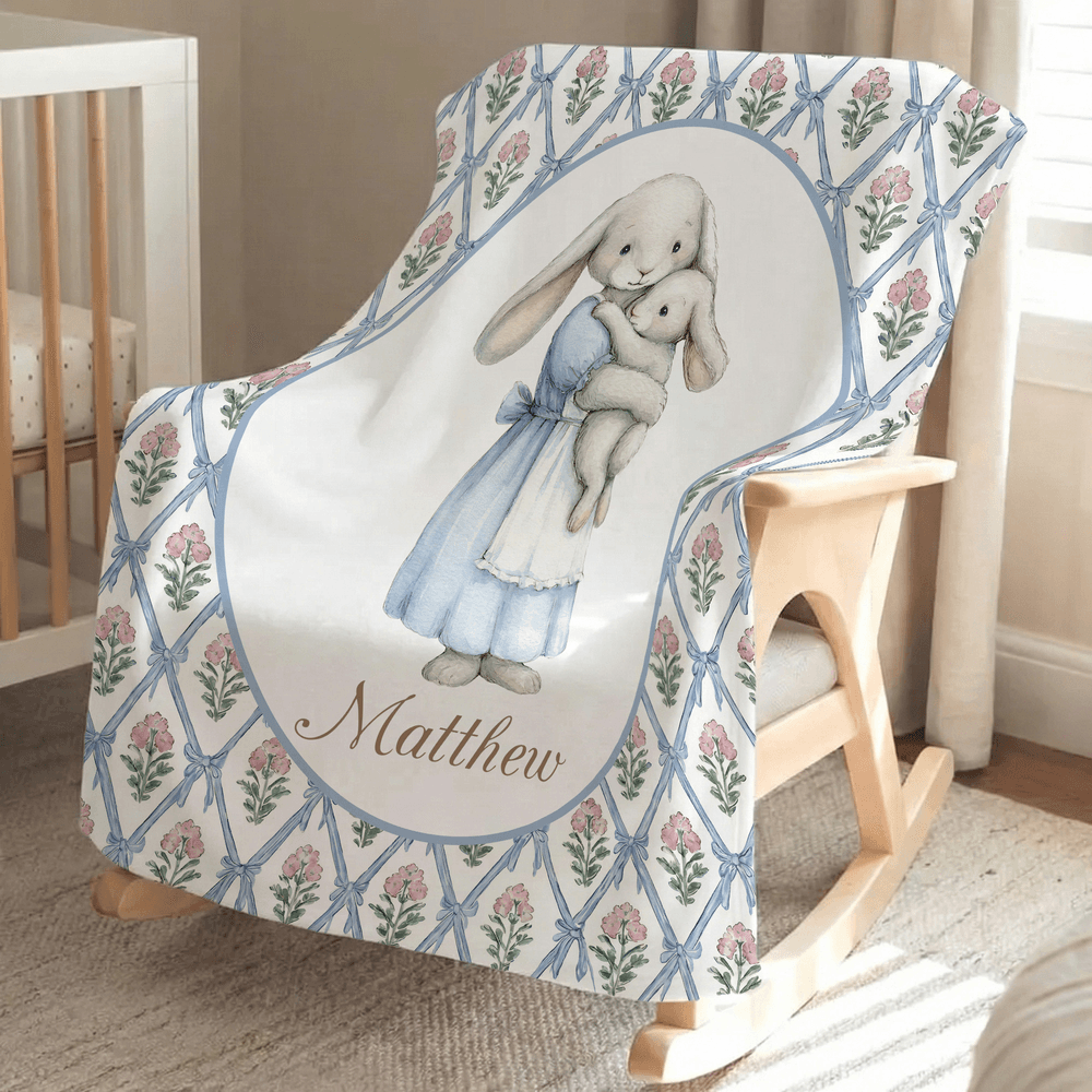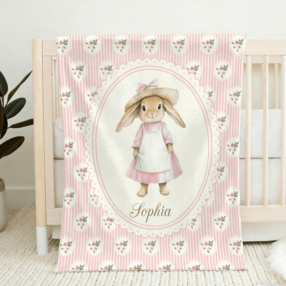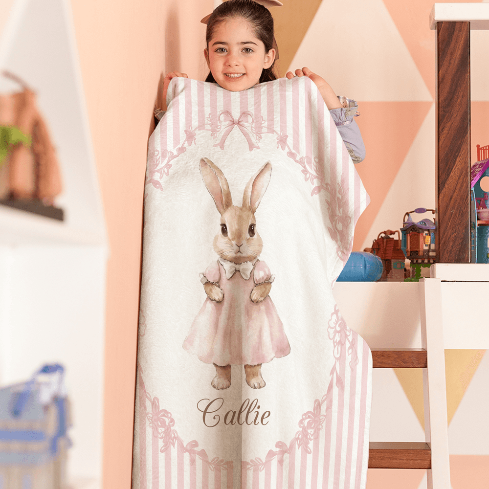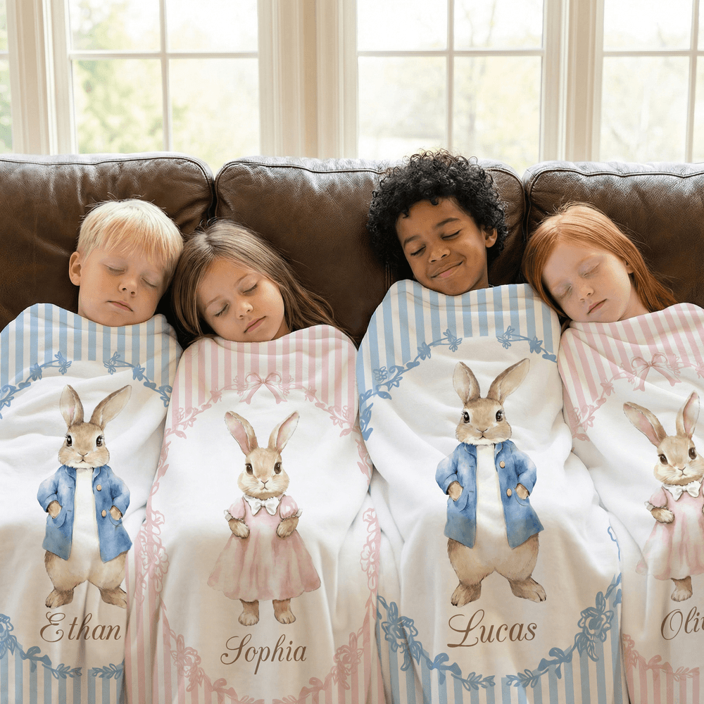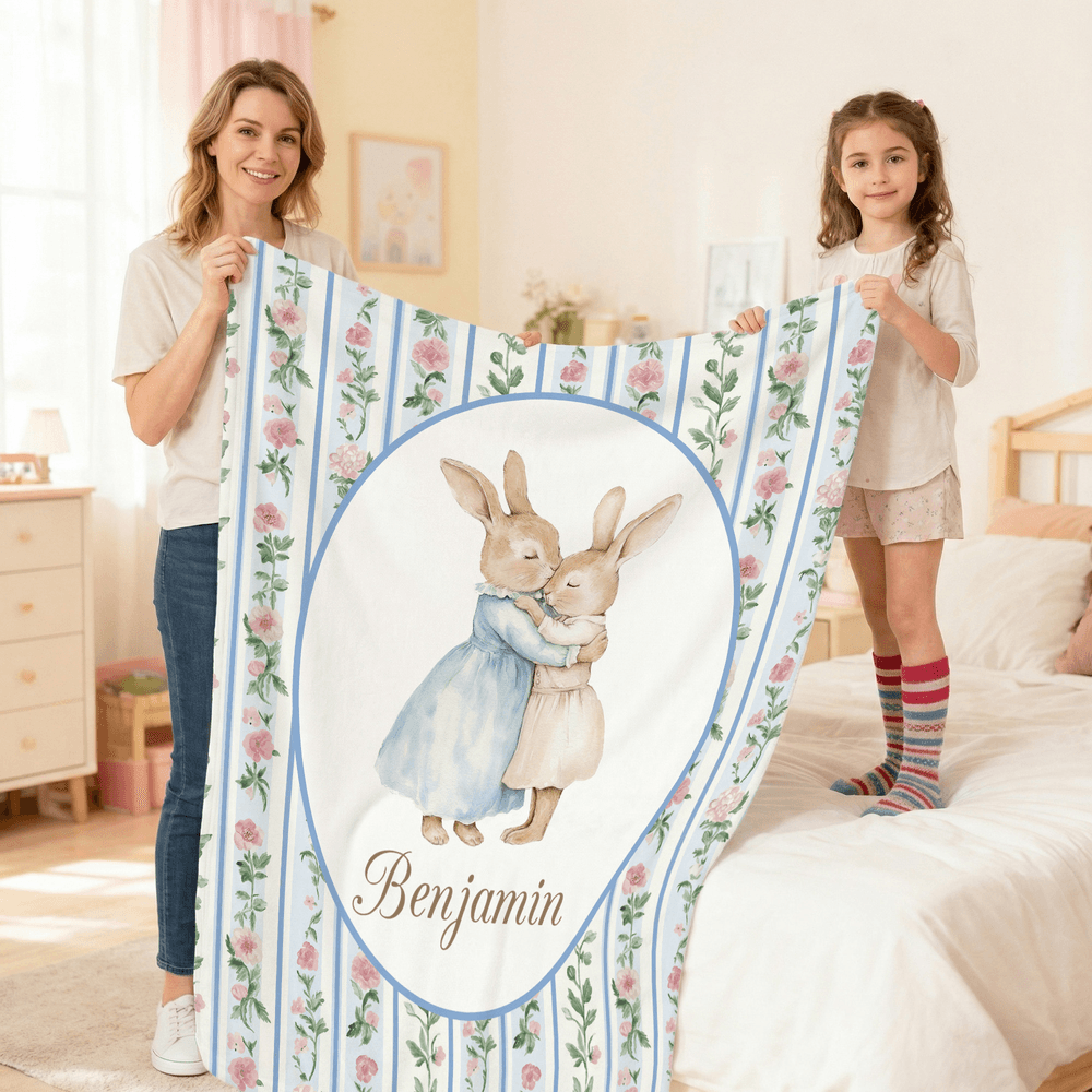 Inspiriert von den klassischen Peter Rabbit-Illustrationen zeigt diese Decke sanfte, liebenswerte Häschen in bezaubernden Outfits und verspielten Posen, die eine gemütliche, märchenhafte Atmosphäre schaffen. Wählen Sie zwischen einem gestreiften oder geblümten Hintergrund in sanften, beruhigenden Farben - zartrosa, mint, hellblau oder warmes Beige - die sich nahtlos in die Kinderzimmereinrichtung einfügen. Eine Personalisierung ist möglich: Fügen Sie den Namen Ihres Kindes hinzu, um ein einzigartiges Andenken zu schaffen.