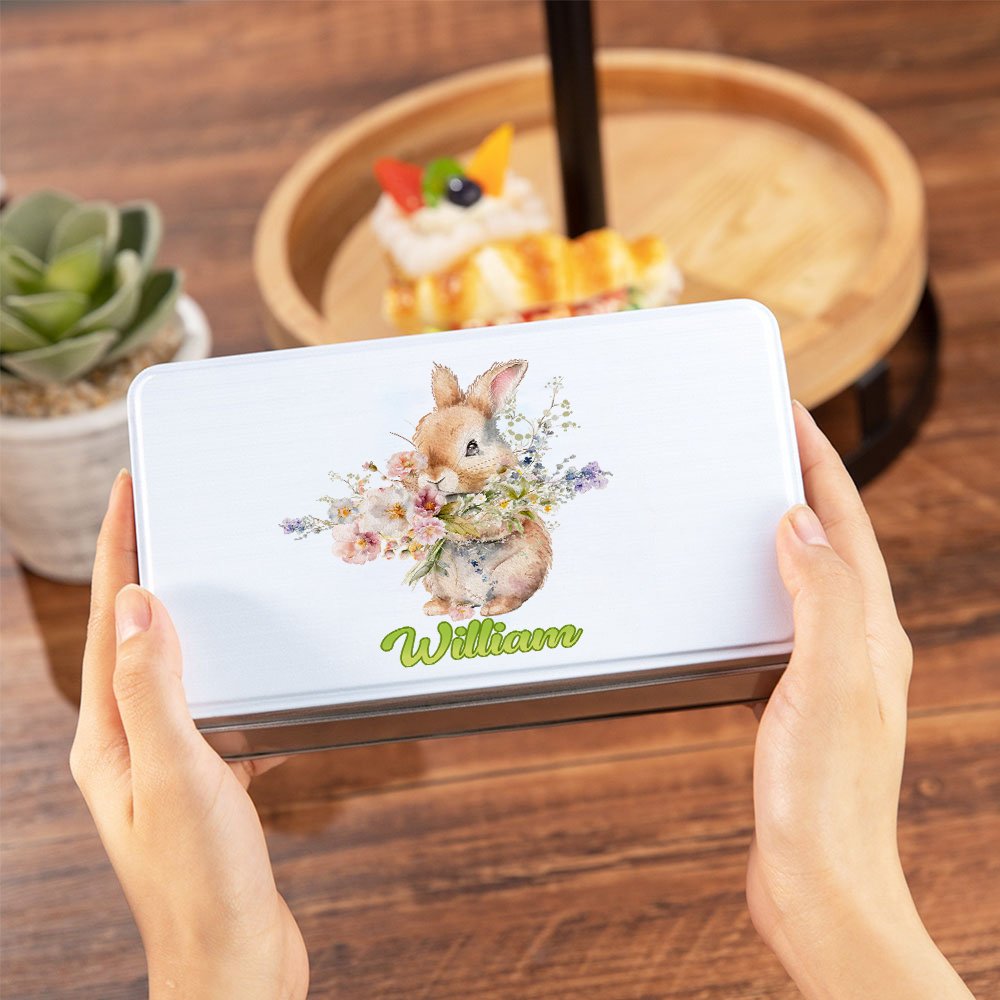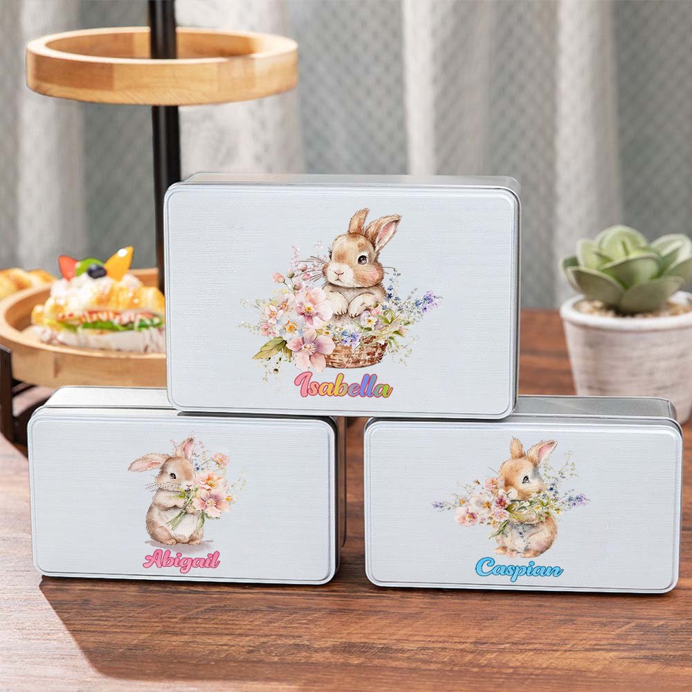 Personalisierte Hase hält Blume Lebensmittelqualität Metall Keksdose mit Namen Ostern Geschenk für Kinder