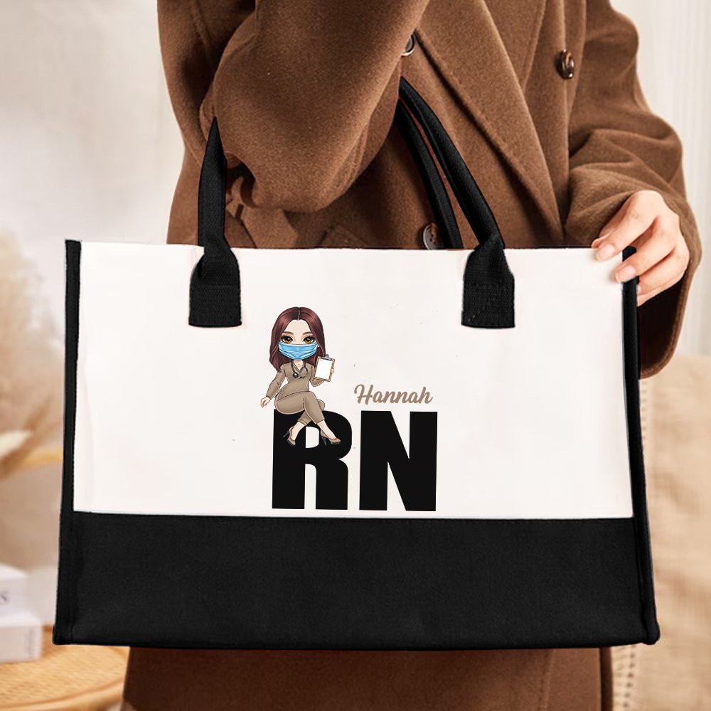Diese personalisierte Tragetasche aus Segeltuch zeigt eine charmante Cartoon-Figur, die medizinisches Personal darstellt. Sie können einen Namen und die Berufsbezeichnung hinzufügen, um diese Tasche zu etwas Besonderem zu machen. Diese Personalisierung verwandelt die Tasche in ein einzigartiges Geschenk.