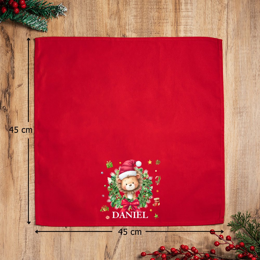 Die liebevoll gestalteten Cartoon-Tierfiguren in festlichem Stil, kombiniert mit Ihrem persönlichen Namen und dezenten Kranzdetails, verleihen dem Design eine verspielte und zugleich herzliche Note. Das klare, unaufdringliche Gesamtbild bringt weihnachtliche Stimmung und persönliche Wärme harmonisch zusammen und verwandelt Ihren Esstisch im Nu in eine festliche Wohlfühloase.