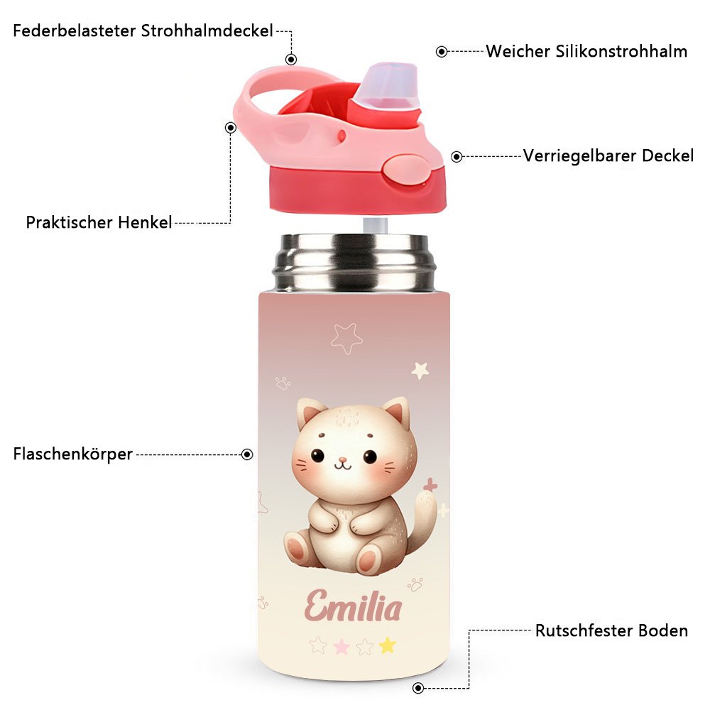 Diese aus hochwertigem Edelstahl gefertigte Wasserflasche ist umweltfreundlich und lebensmittelecht und gewährleistet sicheres und gesundes Trinken. Die stabile und robuste Struktur hält einer langfristigen Nutzung stand. Außerdem verfügt sie über einen praktischen Strohhalm, der sich mit einem leichten Druck öffnen lässt, und das dicht schließende Mundstück verhindert ein Auslaufen. Der verdickte Boden erhöht die Haltbarkeit und macht ihn ideal für den täglichen Gebrauch durch Kinder.