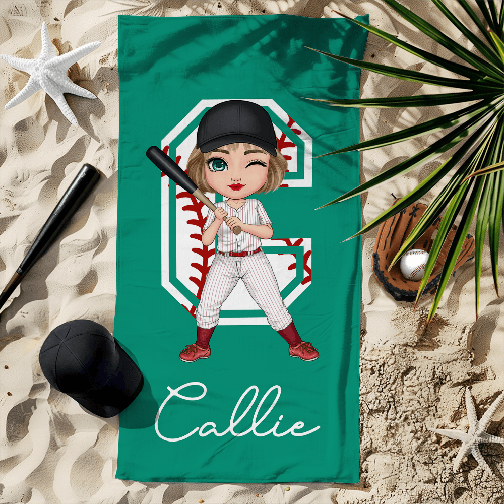 Dieses Strandtuch verbindet perfekt ein sportliches Design mit leuchtenden Farben und unterstreicht so seine energiegeladene Schönheit. Die lebendige Cartoon-Figur, die auf Ihrem Bild basiert, unterstreicht Ihre einzigartige Persönlichkeit. Es kann auch mit einem Namen versehen werden und hat ein sportliches Initialdesign, das von Baseball, Softball, Cricket, Tennis und Badminton inspiriert ist.