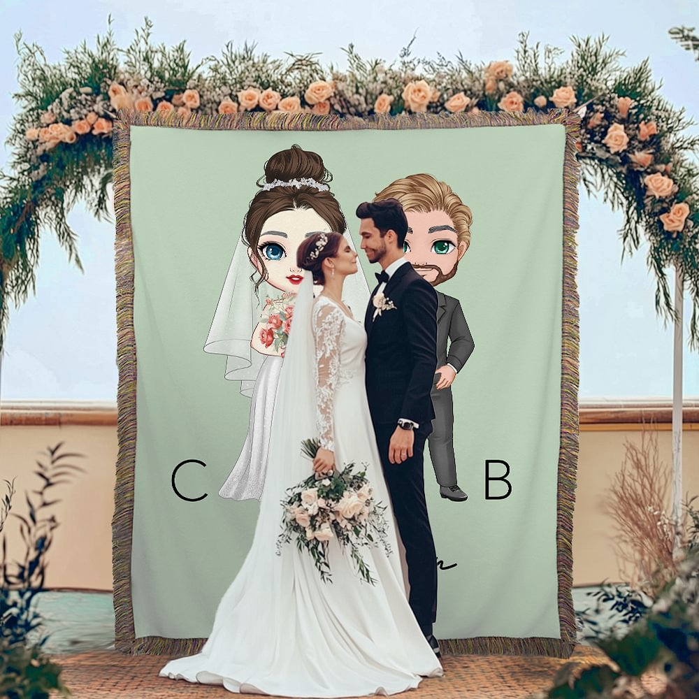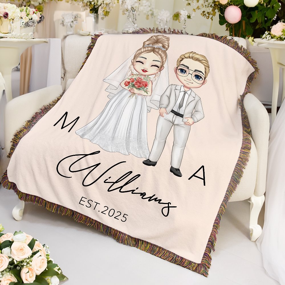 Auf dieser Decke ist ein Cartoon-Brautpaar abgebildet. Sie können das Outfit, die Frisur und vieles mehr der Braut und des Bräutigams individuell gestalten und so ein persönliches Stück für Sie und Ihren Liebsten schaffen. Darüber hinaus kann die Decke mit den Initialen des Brautpaares, dem Familiennamen und dem Hochzeitsdatum individuell gestaltet werden und ist somit die perfekte Möglichkeit, Ihr gemeinsames Leben zu präsentieren.