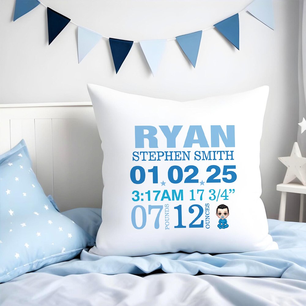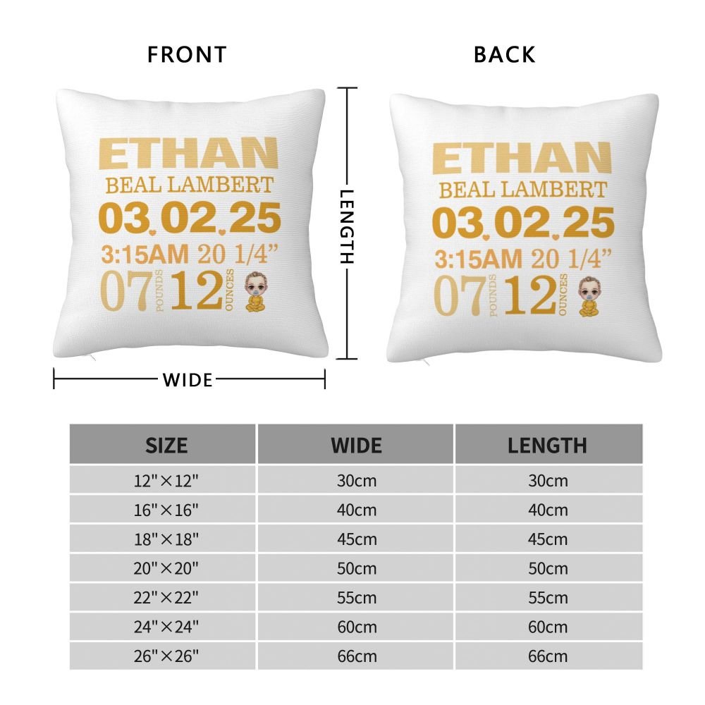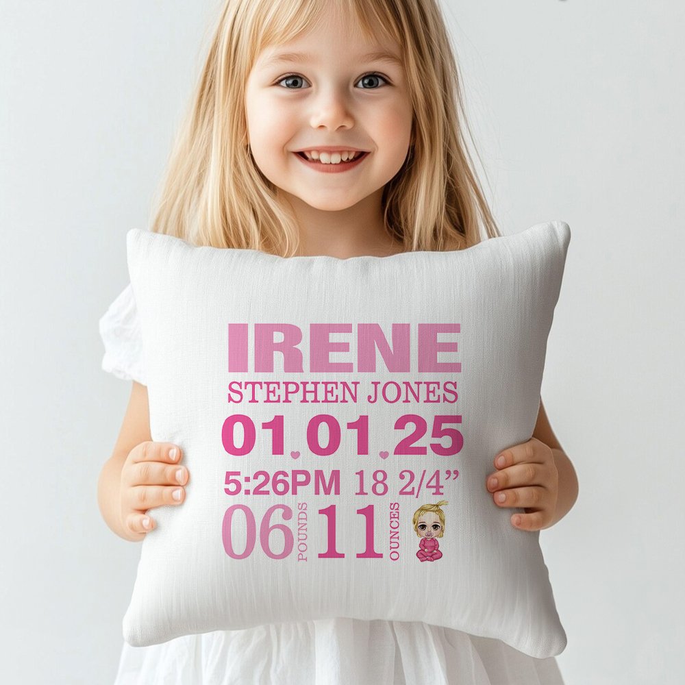 Dieses weiche Kissen lässt sich bis ins kleinste Detail personalisieren, einschließlich Name, Geburtsdatum, Geburtszeit und Gewicht des Babys. Eine niedliche Cartoon-Figur, die das Baby darstellt, macht es zu einem charmanten Erinnerungsstück an die Ankunft des Babys.