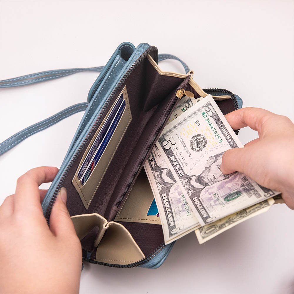 Dieses Portemonnaie wurde mit einem durchdachten Layout mit zwei Fächern, einer Vordertasche, die für die meisten Smartphones geeignet ist, und genügend Platz in der Gesäßtasche für Münzen, Karten und Scheine entworfen. Dank des Crossbody-Schulterriemens kann diese Geldbörse auch als elegante Crossbody-Tasche verwendet werden, was fortschrittlich und vielseitig ist.