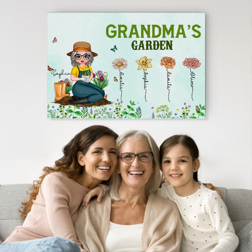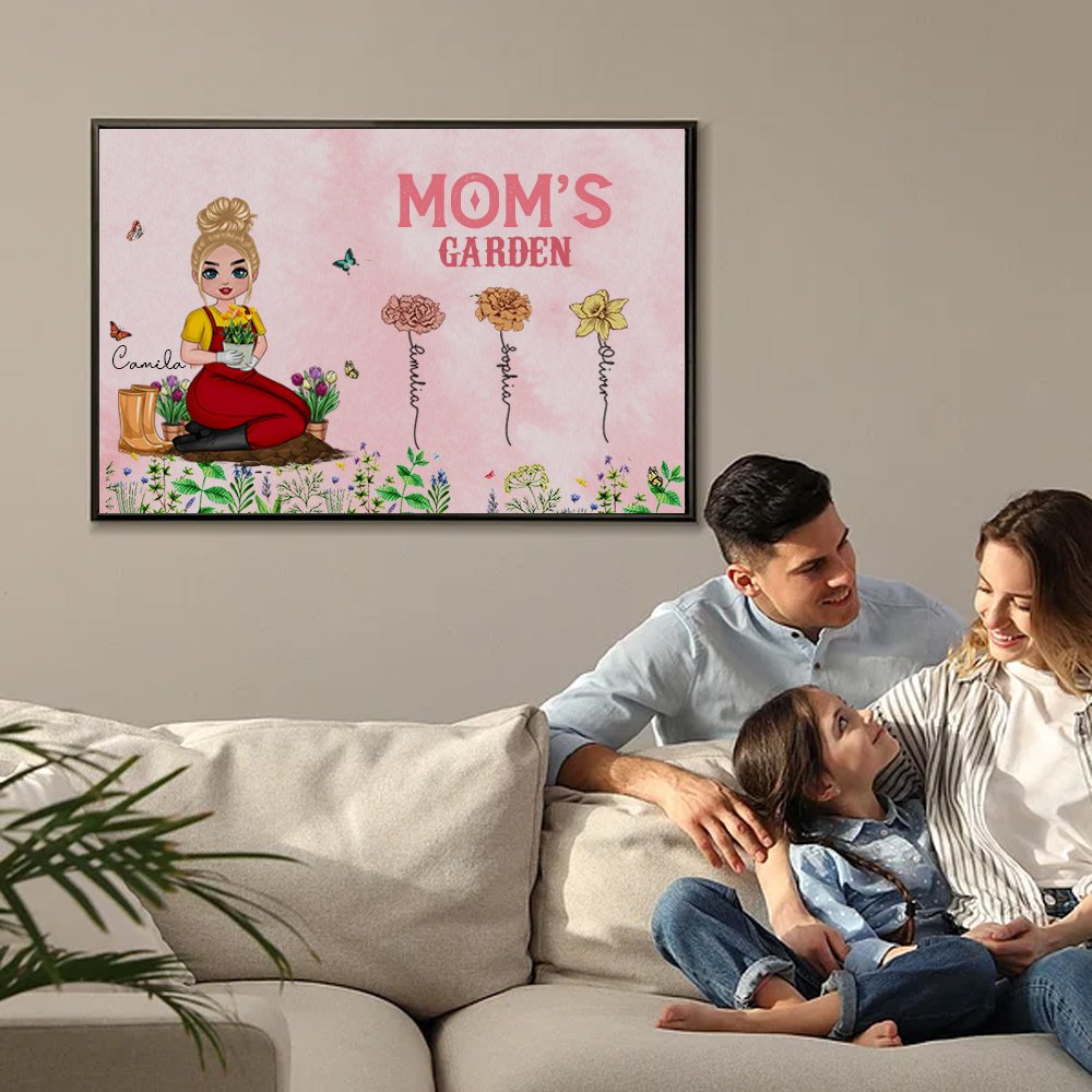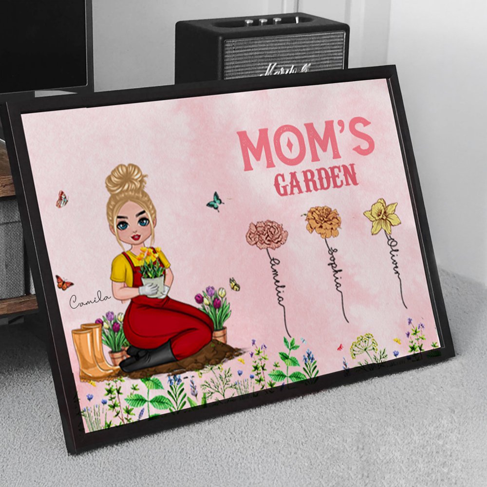 Dieses Bild steht unter dem Motto "GARDEN". Sie können eine Cartoon-Frau Bild hockt im Garten mit einem Topf mit Blumen in ihren Händen, umgeben von verschiedenen bunten Blumenmuster, voller Wärme anpassen. Darüber hinaus können Sie auch 1-12 Namen und Geburtstagsblumen, die jedes Familienmitglied symbolisieren, individuell gestalten, um diesem Bild eine persönliche Note zu verleihen. Wir bieten 3 Stile und 9 Farben an, die Sie nach Ihren Vorlieben auswählen können.
