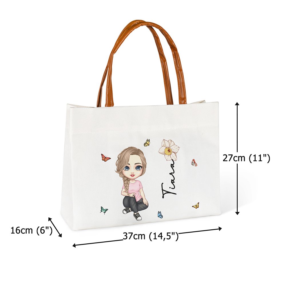Diese bezaubernde Handtasche aus Canvas zeigt ein einzigartiges Cartoon-Charakter-Design mit der entsprechenden Geburtsblume des Monats. Sie können sie mit einem Namen versehen und sie so in ein einzigartiges und besonderes Geschenk verwandeln.