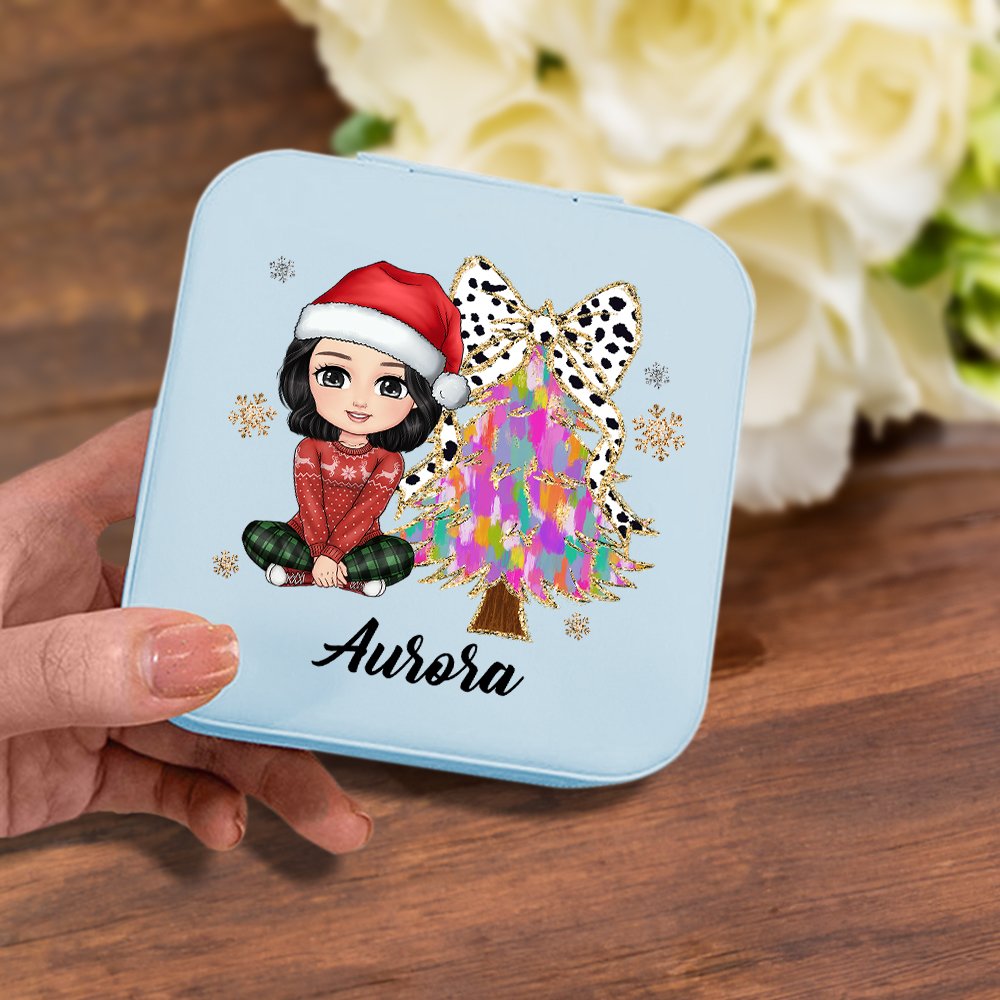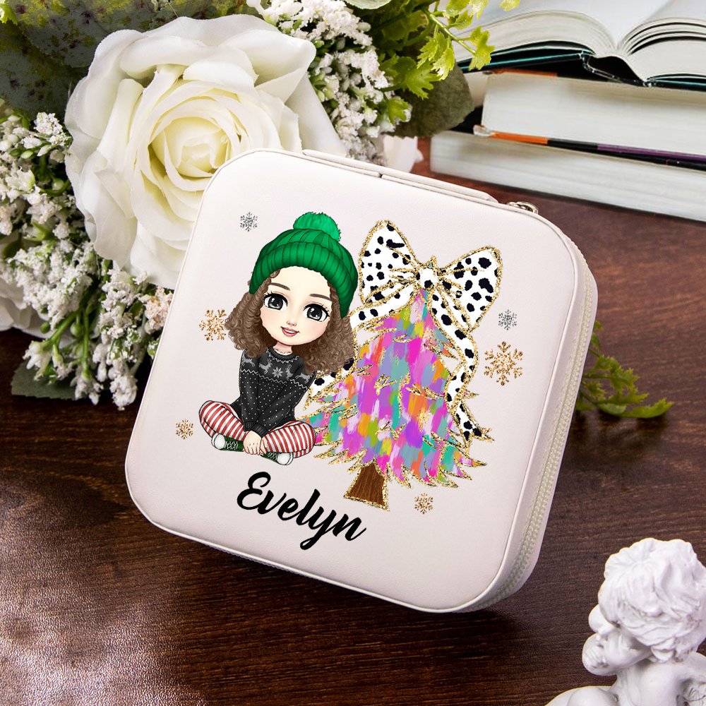 Dieses tragbare Schmuckkästchen zeigt ein niedliches Charakterbild und einen bunten Weihnachtsbaum. Sie kann mit dem Bild und dem Namen individuell gestaltet werden. Das verspielte und niedliche Design passt perfekt zur weihnachtlichen Atmosphäre und bietet eine charmante und einzigartige Möglichkeit, Ihre wertvollen Accessoires für unterwegs aufzubewahren.