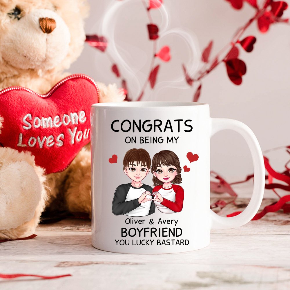 Diese Tasse zeigt 2 verliebte Zeichentrickfiguren, die Sie von der Haarfarbe bis zur Hemdfarbe und den Namen individuell gestalten können. Es ist eine herzliche Art, Ihre Beziehung zu feiern und ein einzigartiges und exklusives Stück Dekoration zu schaffen. Mit Sprüchen wie "congrats on being my," etc. fängt diese Tasse die Essenz Ihrer Beziehung ein.