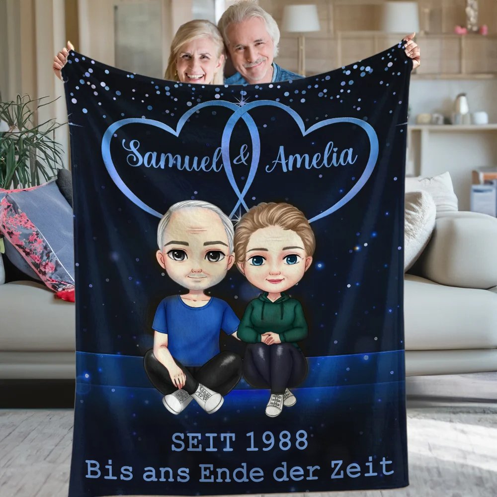Diese personalisierte Decke zeigt ein liebenswertes Cartoon-Paar, das von einem Doppelherzmotiv geziert wird, das mit den Namen des Paares versehen werden kann. Unterhalb der Figur können eine besondere Jahreszahl und ein Text hinzugefügt werden. Diese Decke ist ein wirklich einzigartiges und bedeutungsvolles Geschenk, das Liebe und Wärme symbolisiert.