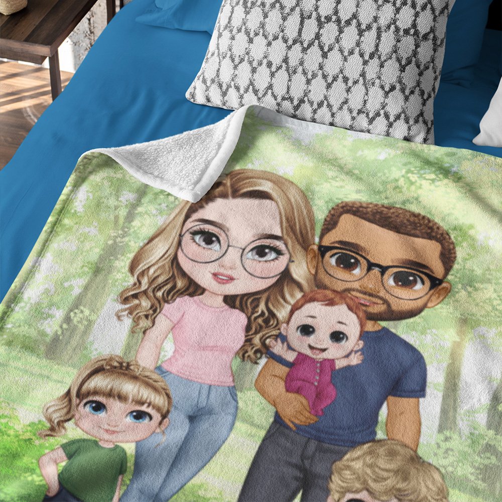 Diese Decke ist mit warmen Familienmitgliedern gestaltet. Es gibt mehrere Charakter-Muster für Sie zu wählen. Sie können Ihre eigene einzigartige Decke nach Ihren Vorlieben wählen. Das grüne Hintergrundmuster verleiht einen Hauch von Wärme.