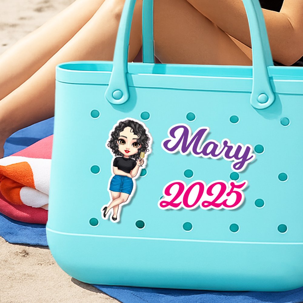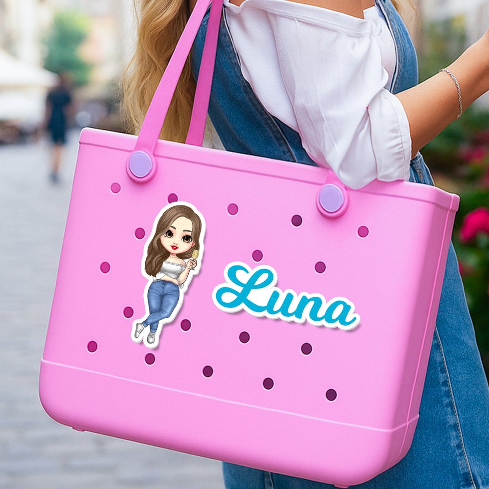 Dieses Taschen-Accessoire verfügt über einzigartige Cartoon-Charakter-Designs, die von der Haarfarbe bis zur Kleidungsfarbe reichen, um Ihren Stil zu reflektieren, und es gibt 33 Namens- oder Textfarben, aus denen Sie wählen können. Das macht es zu einem einzigartigen Modeartikel.