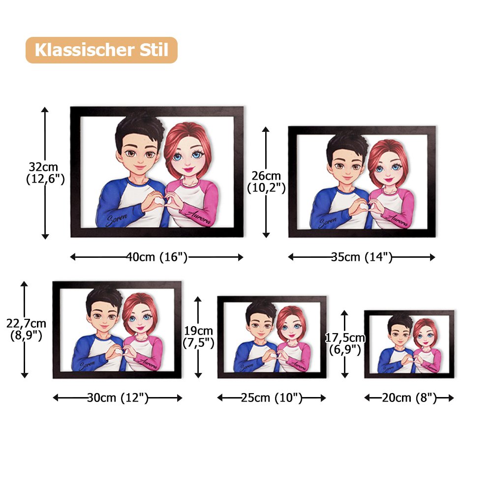 Der Rahmen zeigt ein herzerwärmendes Design mit Cartoon-Figuren, die eine Herz-Geste machen. Jede Figur kann mit Ihrem Namen personalisiert werden, was ihm einen Hauch von Individualität verleiht und ihn zu einem echten Unikat macht.