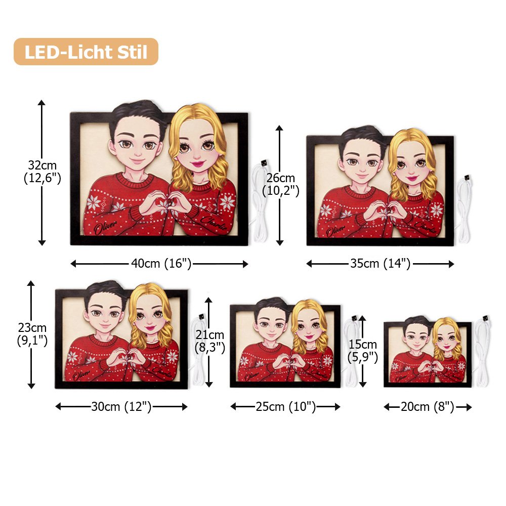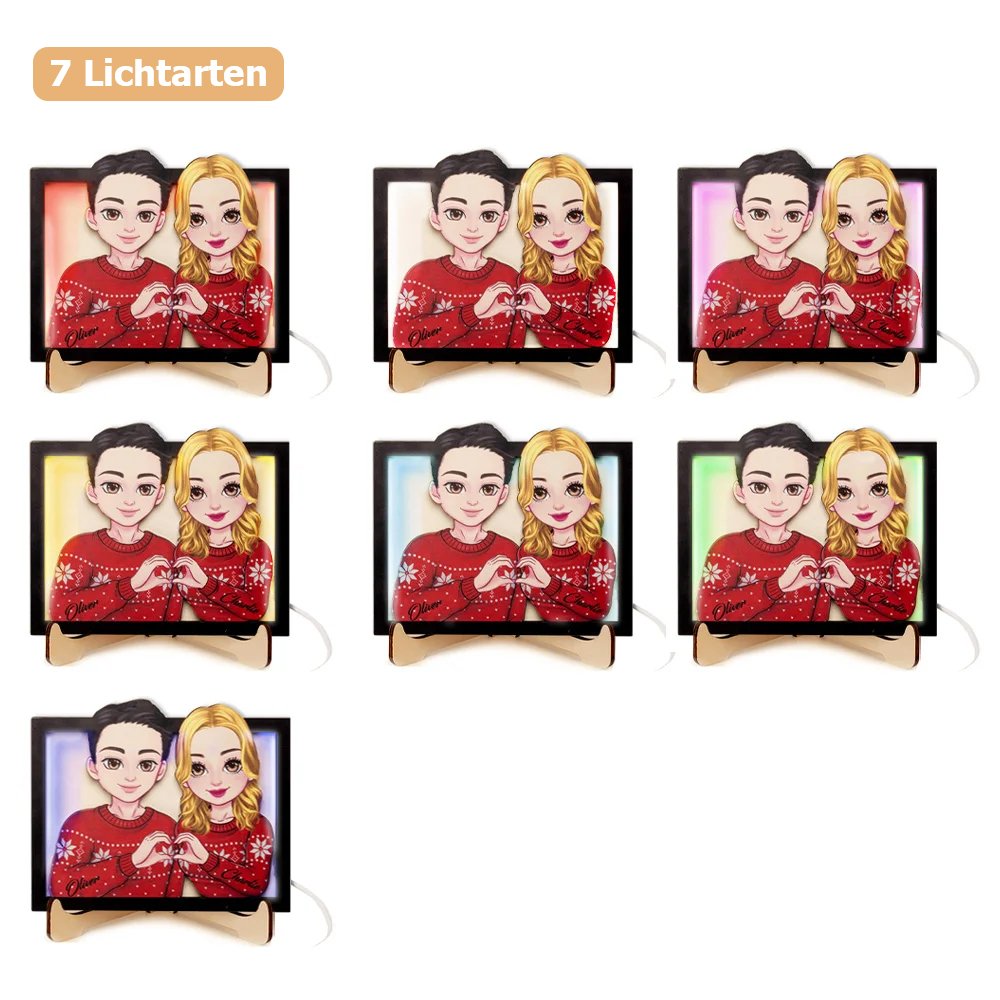 Der klassische Stil ohne Licht ist eine bewährte Option. Der Fokus liegt auf dem ästhetisch ansprechenden Holzrahmen und den detaillierten Cartoon-Figuren, wodurch die Handwerkskunst in ihrer ursprünglichsten Form geschätzt werden kann. Zudem ist eine Variante mit warmem Licht erhältlich. Das weiche, warme Licht verstärkt die romantische Atmosphäre und lässt die Comicfiguren zum Leben erwachen. Für diejenigen, die eine lebendigere Atmosphäre bevorzugen, ist der Buntlicht-Stil die richtige Wahl. Die ständig wechselnden, leuchtenden Farben verleihen dem Rahmen ein lustiges und dynamisches Element und machen ihn zu einem Blickfang.
