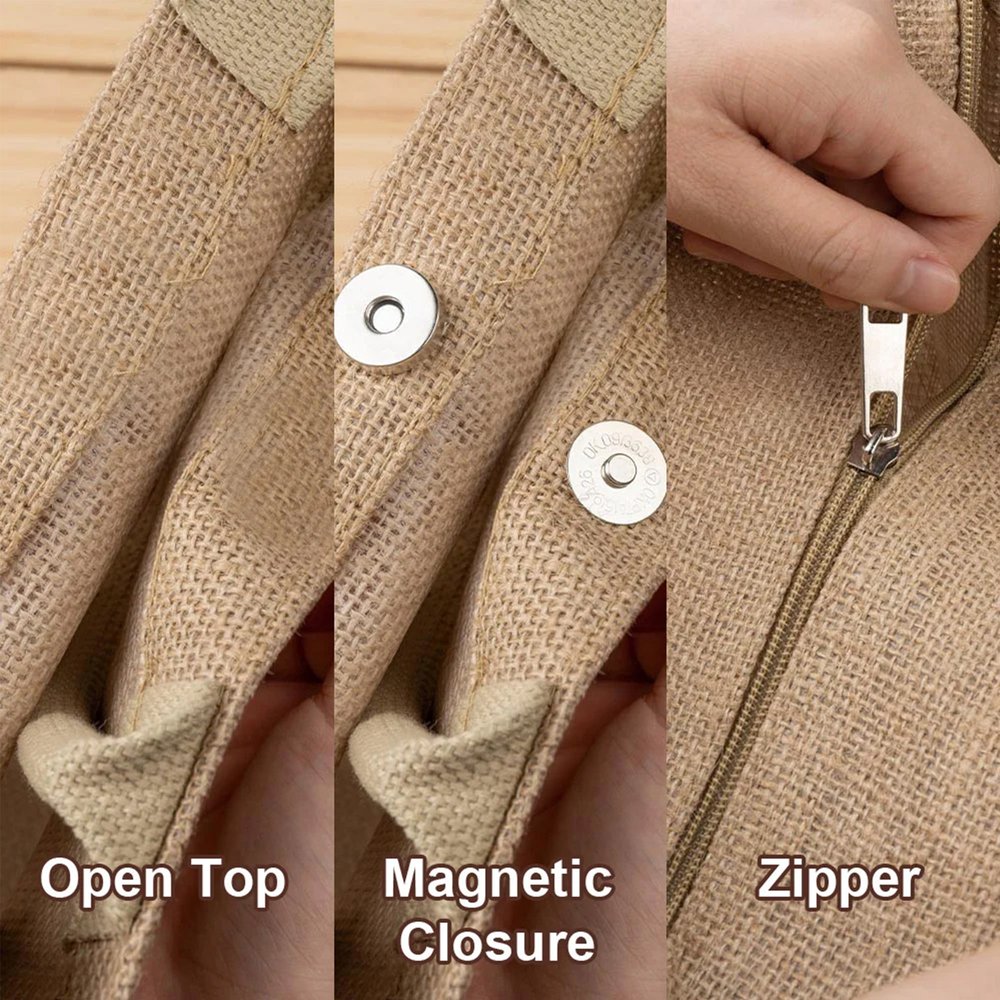 Die aus Jute gefertigte Tasche hat eine dicke, elastische Struktur, die dem täglichen Gebrauch oder dem Tragen von Geschenkgewichten standhält. Sie ist verformungs- und verschleißfest und behält auch bei voller Beladung ihre Form. Die natürliche Maserung der Jute bietet eine rustikale Textur und umweltfreundliche Eigenschaften, die Haltbarkeit und Ästhetik für den langfristigen Gebrauch in Einklang bringen.