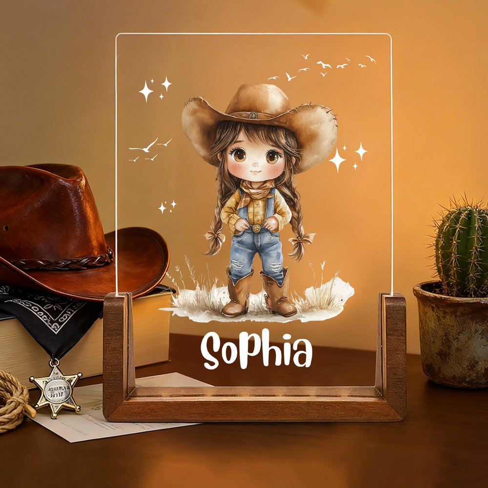 Dieses Nachtlicht wurde für das freigeistige Cowgirl entworfen und kombiniert rustikalen Western-Charme mit einer persönlichen Note. Wählen Sie aus 20 lebendigen Cowgirl-Illustrationen, fügen Sie einen Namen hinzu und wählen Sie aus sieben stilvollen Schriftarten, um ein einzigartiges Stück zu gestalten.