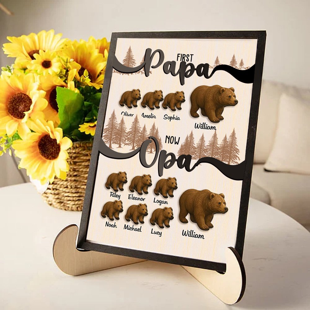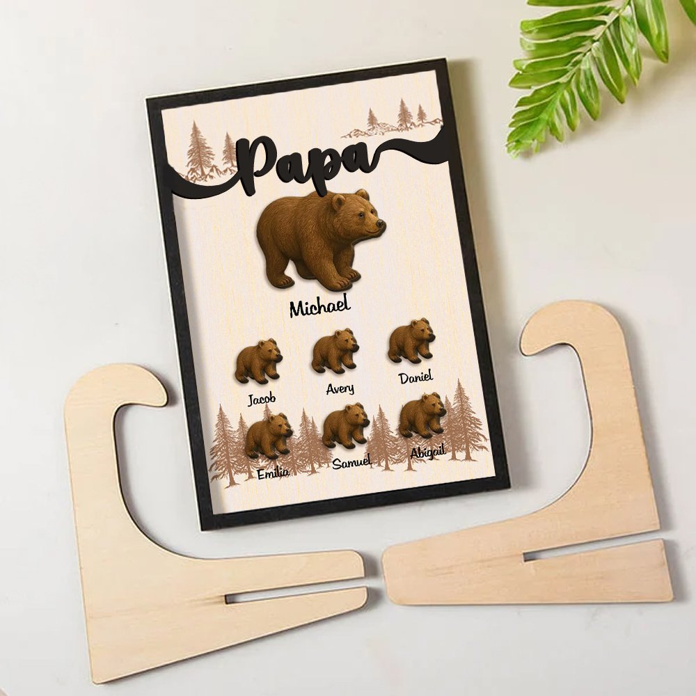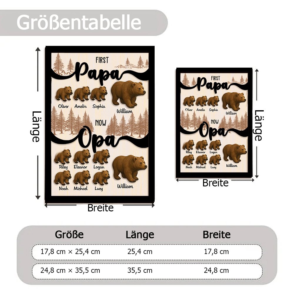 Diese Holzdekoration zeigt eine bezaubernde Cartoon-Bärenfamilie vor einem Zedernholz-Hintergrund und stellt eine liebevolle Szene mit einem Bärenvater und seinen Jungen dar. Sie haben die Möglichkeit, bis zu 22 Bären individuell mit Namen zu versehen, um jedes Familienmitglied persönlich darzustellen. Wählen Sie dabei aus zwei charmanten Stilvarianten, die ganz nach Ihrem Geschmack gestaltet sind.