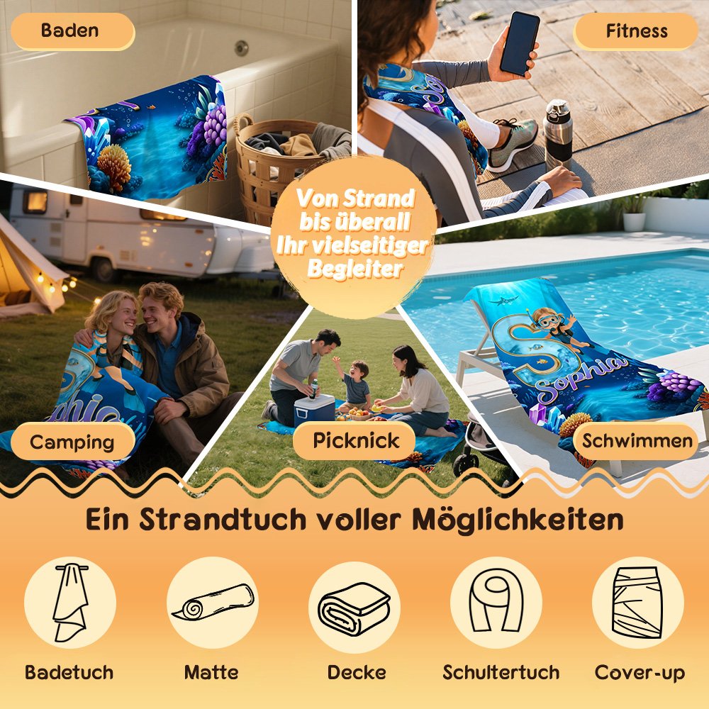 Dieses Strandtuch zeigt einen tauchenden Jungen und ein tauchendes Mädchen aus einem Cartoon und kann mit der Initiale und dem Namen Ihres Kindes personalisiert werden. Es ist mit einer tiefblauen Unterwasserszene und Meereselementen wie Korallen, kleinen Fischen und Seifenblasen gepaart, die eine wunderbare Atmosphäre schafft, die die Sehnsucht der Kinder nach der Erforschung des Meeres perfekt einfängt.