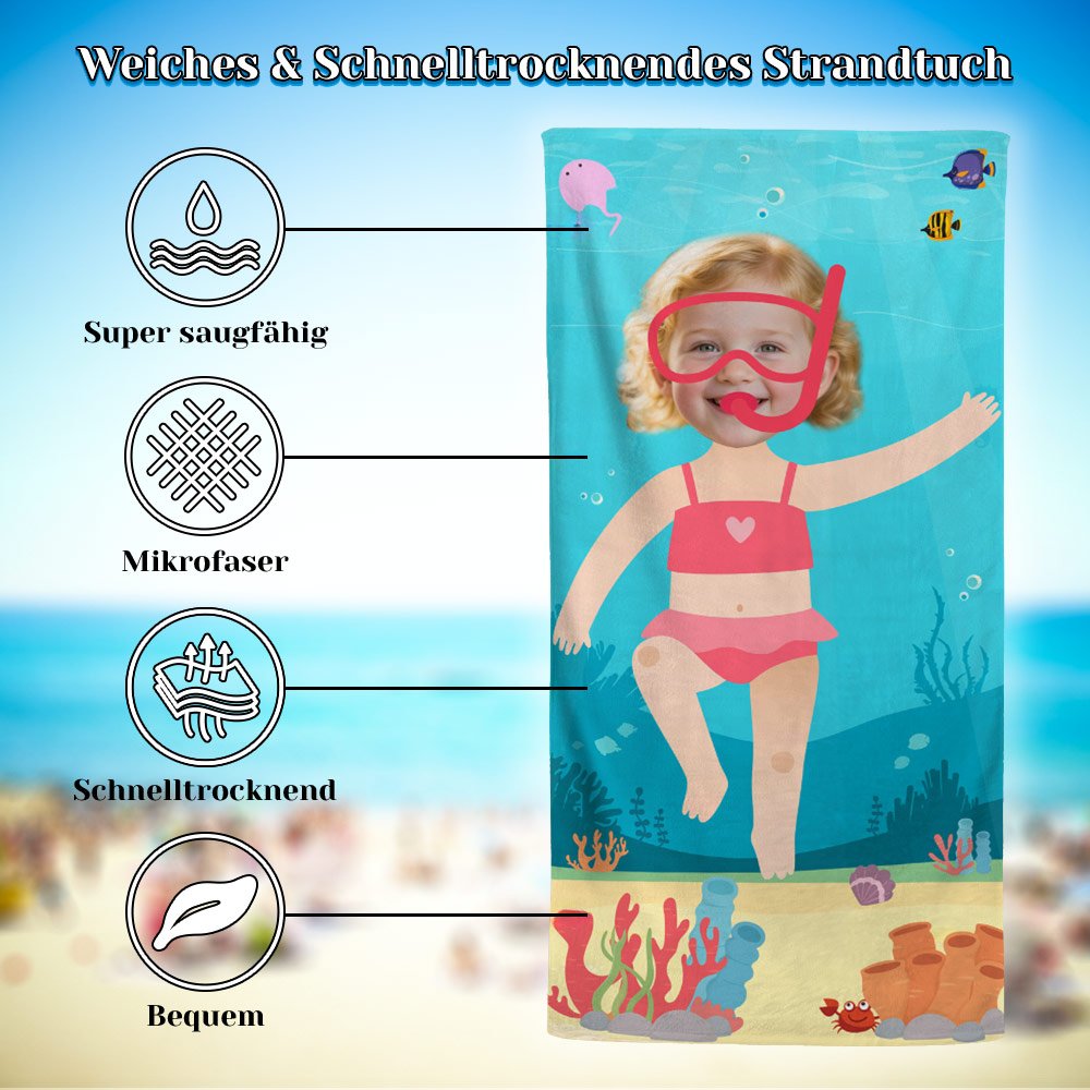 Dieses Strandtuch zum Thema Tauchen zeigt einen verspielten Cartoon-Taucher, der von einer lebhaften Unterwasserwelt umgeben ist. Mit lebendigen Farben und charmanten Meereselementen wie Korallen und Fischschwärmen regt es die Fantasie der Kinder an und erweckt die Unterwasserwelt zum Leben. Um dem Strandtuch eine persönliche Note zu verleihen, kann es mit dem Foto eines Kindes versehen werden, wodurch es zu einem einzigartigen Accessoire wird, das die Kinder lieben werden.