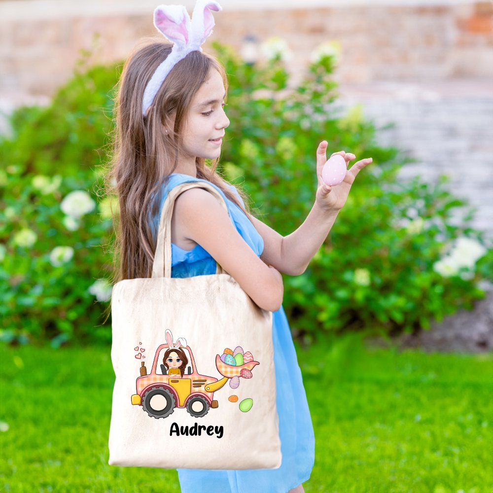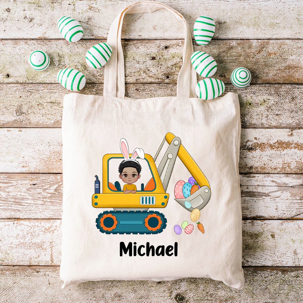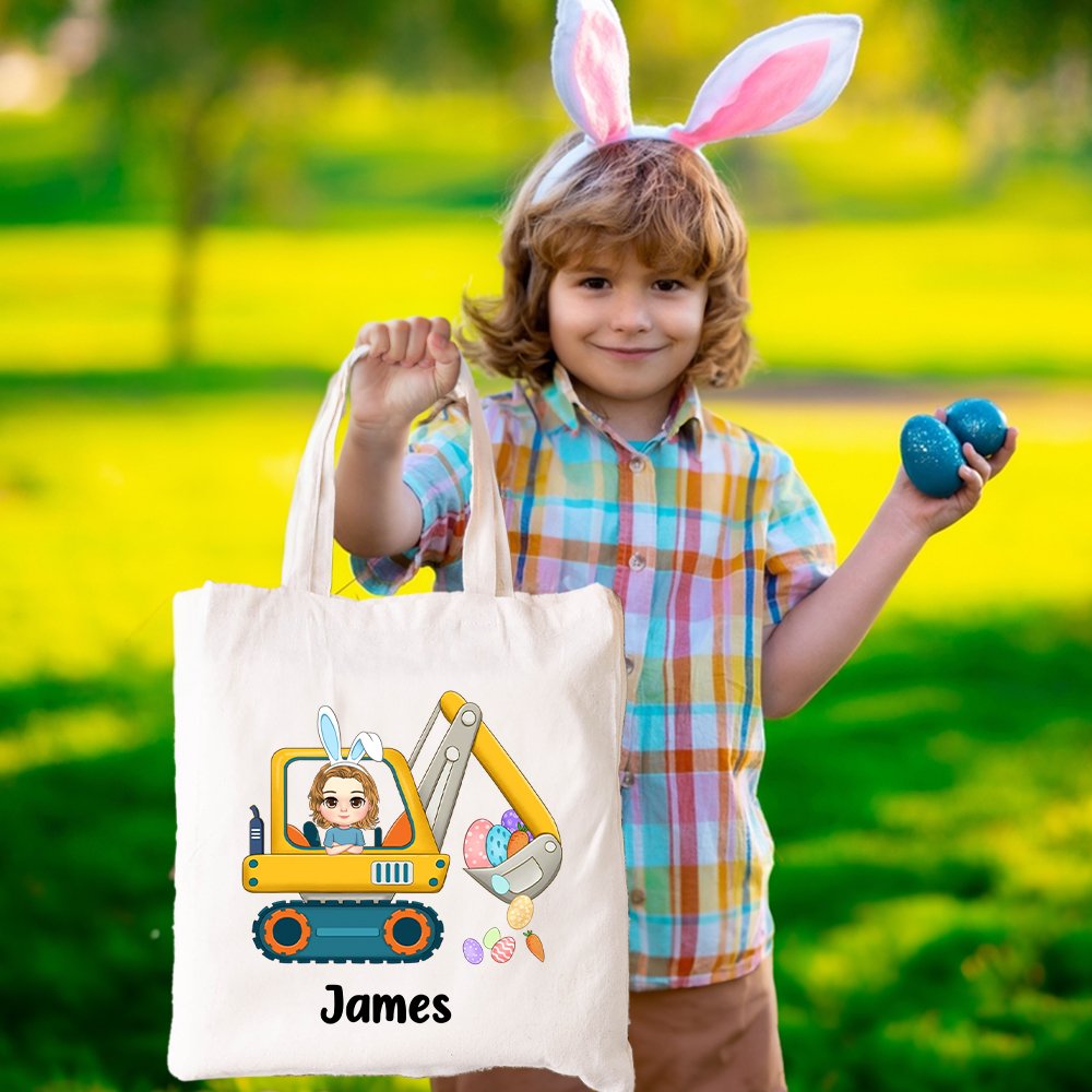 Diese Tragetasche zeigt eine entzückende Bagger-Cartoon-Figur, die von bunten Ostereiern umgeben ist, was die Fantasie und die Begeisterung Ihres Kindes während der Feiertage sicher anregen wird.