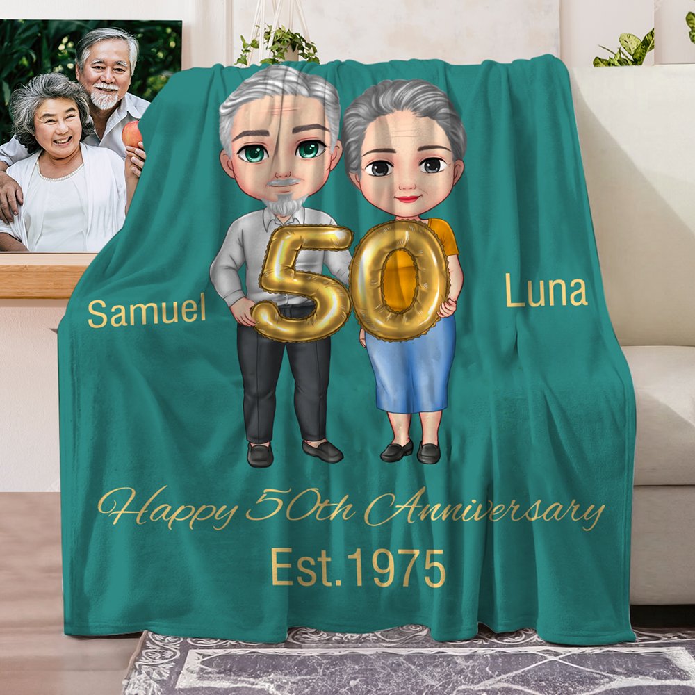 Diese personalisierte Decke wurde entworfen, um die Liebe und die Erinnerungen eines älteren Paares zu feiern. Mit Cartoon-Illustrationen eines älteren Paares können Sie die Decke mit ihren Namen und 2 besonderen Botschaften individuell gestalten. Der Zusatz von Rosen verstärkt das romantische Gefühl und schafft ein sentimentales Geschenk, das noch jahrelang in Ehren gehalten werden wird.