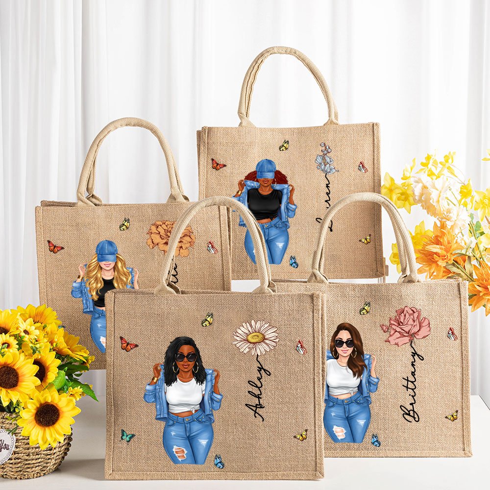 Diese Jute-Tasche zeigt eine Cartoon-Frau in einem stylischen Denim-Outfit, die Selbstvertrauen und Lebensfreude ausstrahlt. Sie ist umgeben von Geburtstagsblumen und Schmetterlingsmustern, gepaart mit einem anpassbaren Namen, der ein Gefühl von Exklusivität und Spaß vermittelt.